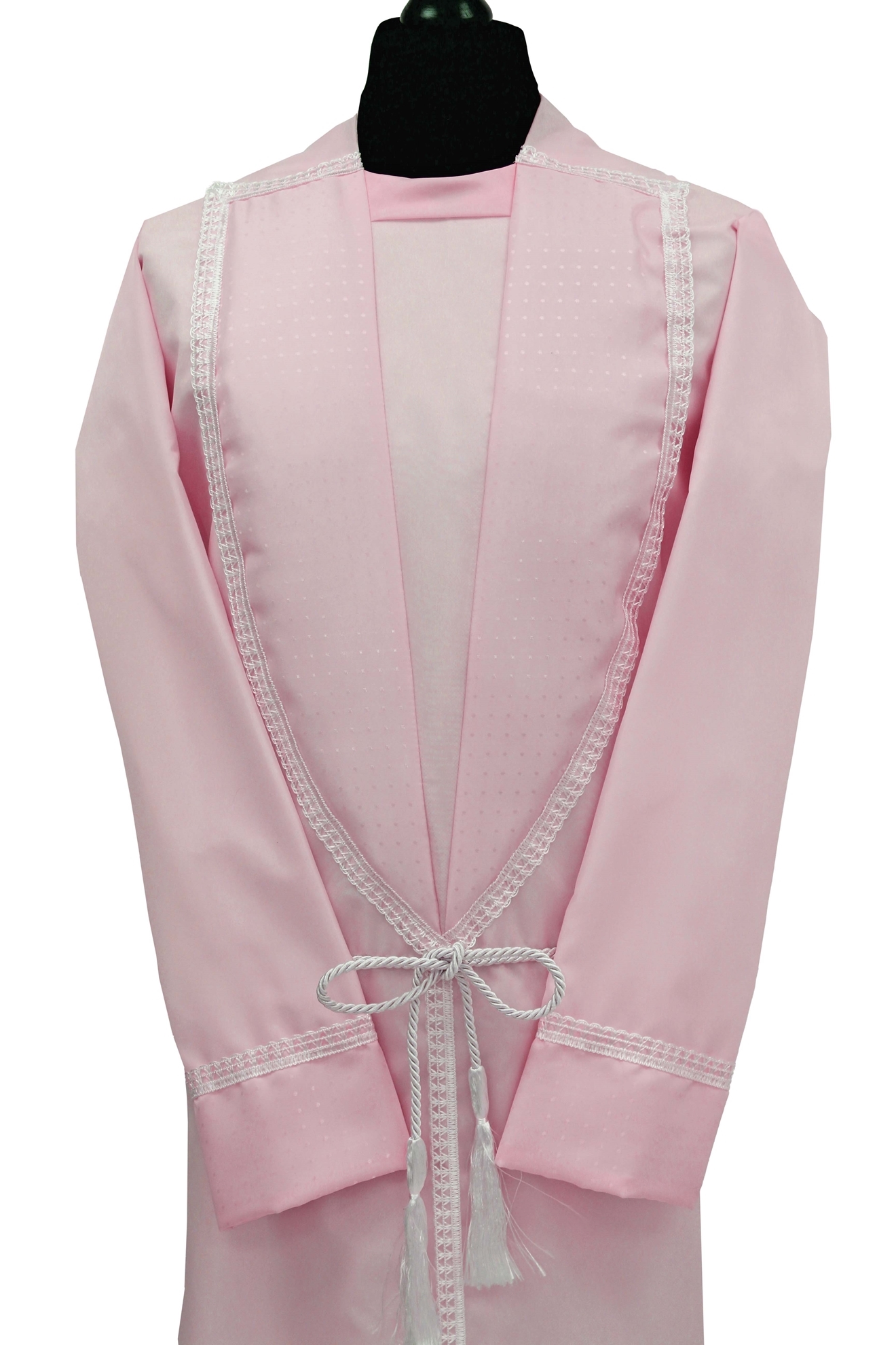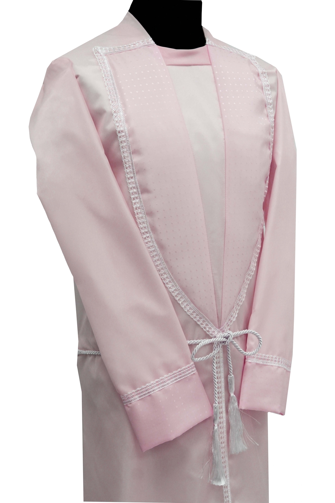 Taffeta 115 Gown with a Spot Dobby Lapel and Cuff.  Available in: Blue, Cream, Pink, Rosebud and White with an option of a 9" or 12" Frill.