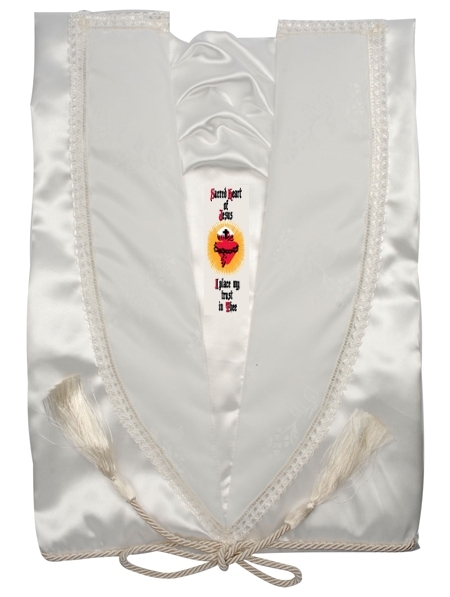 Satin 602 Gown with a Decorative Lapel and Cuffs and a Roman Catholic "Sacred Heart" Decoration on the Front of the Gown. Available in White with an option of a 9" or 12" Frill.