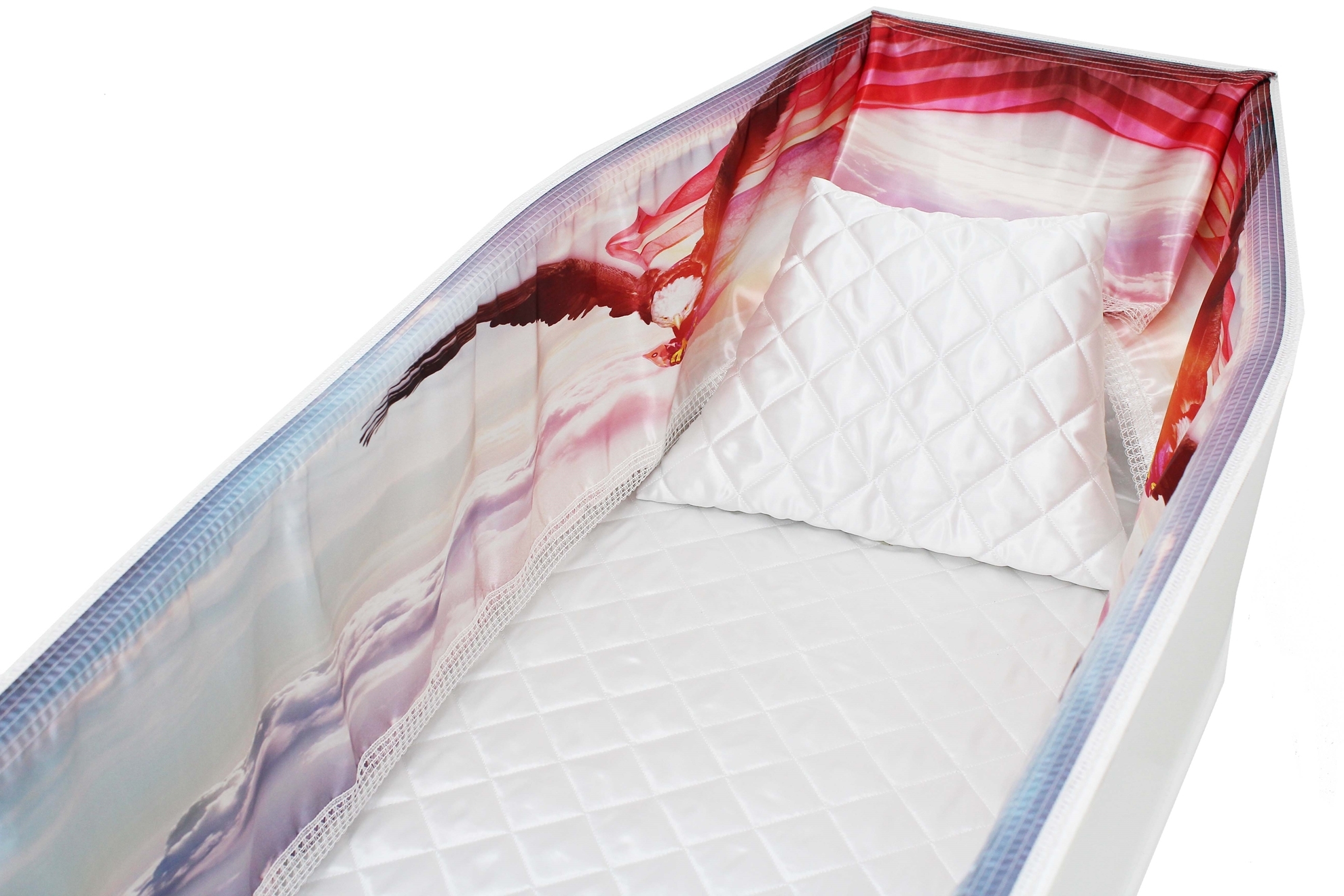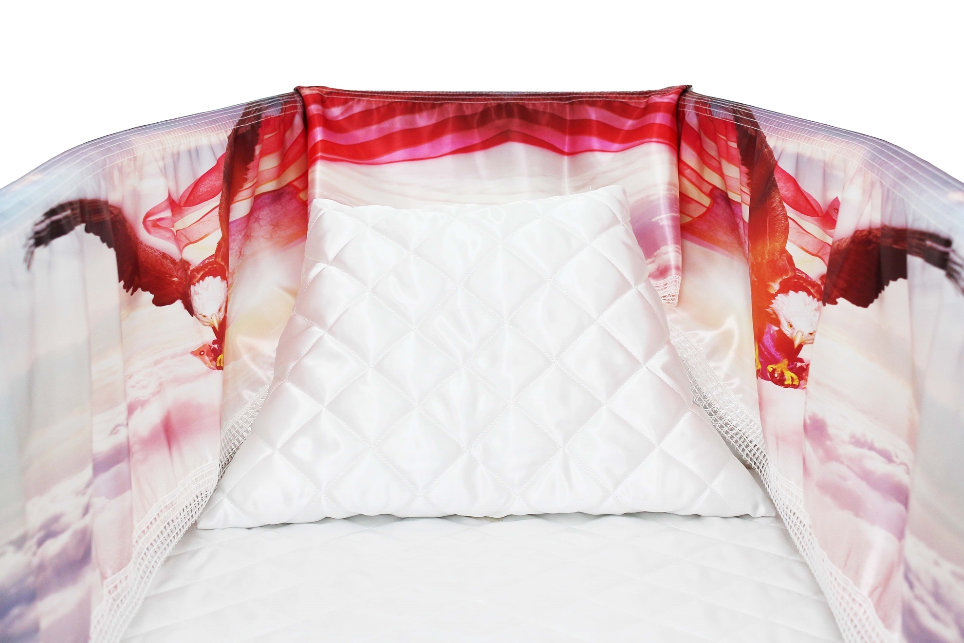 Luxury satin interior printed using water-based ink. The printed interior set consists of a 18-inch 2 Way printed satin frill, printed satin facecloth, quilted satin pillow and a quilted satin mattress.The chosen design will be printed on the interior. Image is to illustrate style of Interior Only.