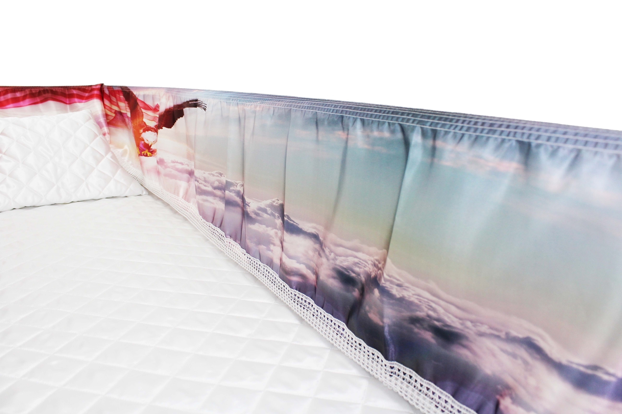 Luxury Satin 18-inch 2-way frill consisting of a 12-inch internal frill with an additional 6-inch exterior frill. The chosen design will be printed on the 18" 2-Way Frill. Please note the image shows a mattress and a pillow which are NOT included. Image is to illustrate style of Interior Only.