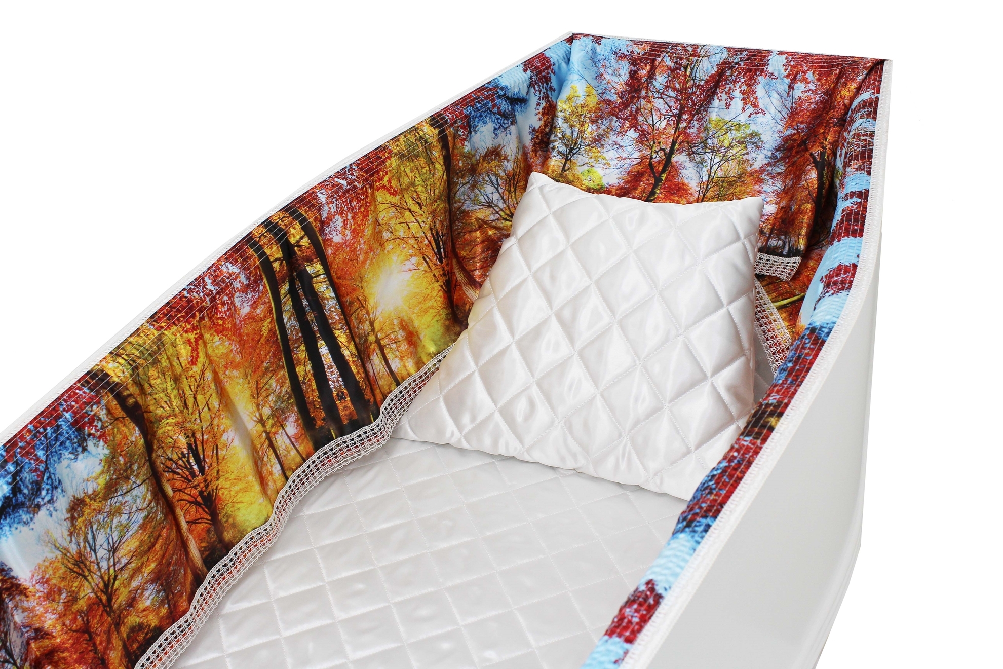 Luxury satin interior printed using water-based ink. The printed interior set consists of a 18-inch 2 Way printed satin frill, printed satin facecloth, quilted satin pillow and a quilted satin mattress.The chosen design will be printed on the interior. Image is to illustrate style of Interior Only.