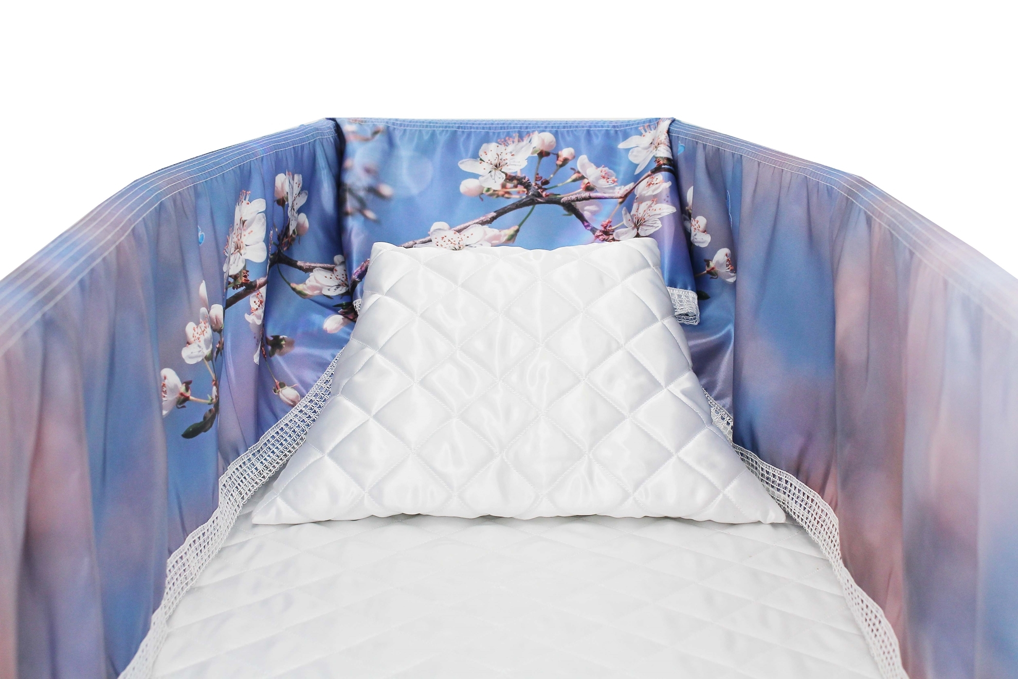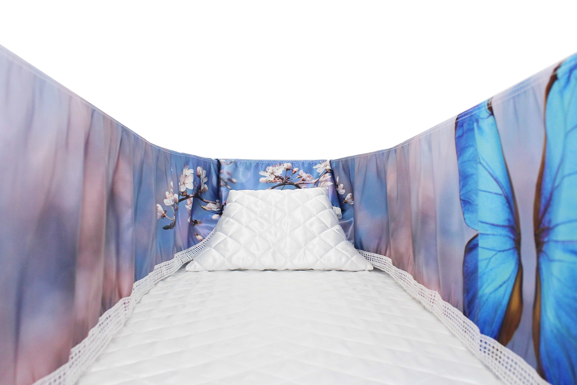 Luxury satin interior printed using water-based ink. The printed interior set consists of a 12-inch printed satin frill, printed satin facecloth, quilted satin pillow and a quilted satin mattress.