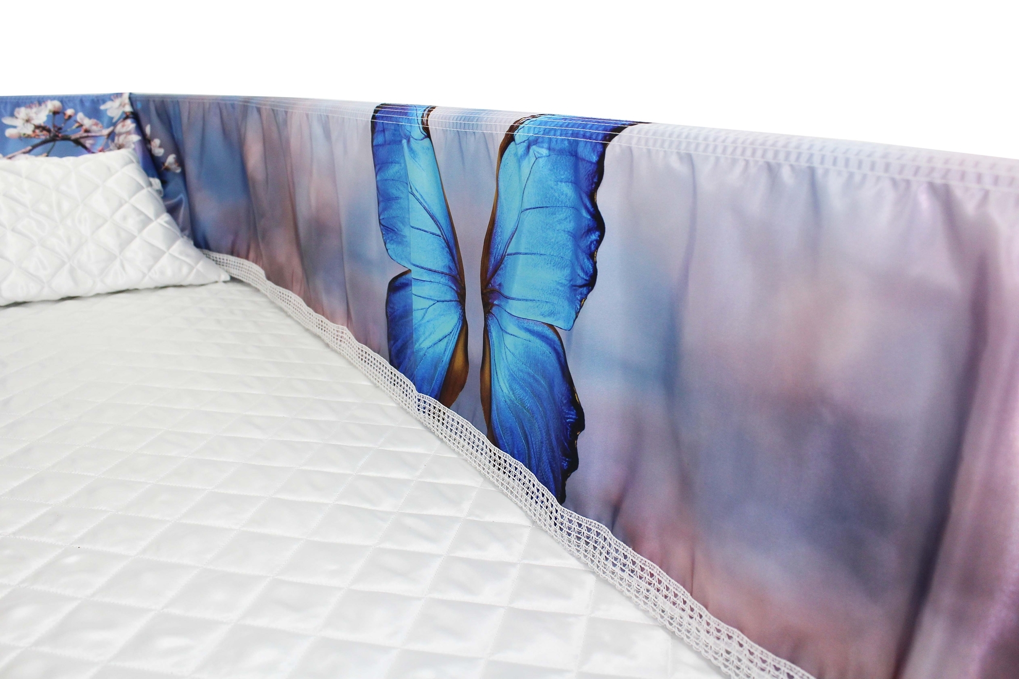 Luxury Satin 18-inch 2-way frill consisting of a 12-inch internal frill with an additional 6-inch exterior frill. The chosen design will be printed on the 18" 2-Way Frill. Please note the image shows a mattress and a pillow which are NOT included. Image is to illustrate style of Interior Only.