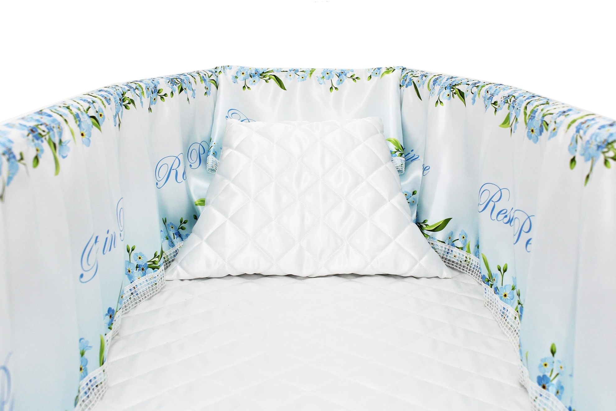 Luxury satin interior printed using water-based ink. The printed interior set consists of a 12-inch printed satin frill, printed satin facecloth, quilted satin pillow and a quilted satin mattress.