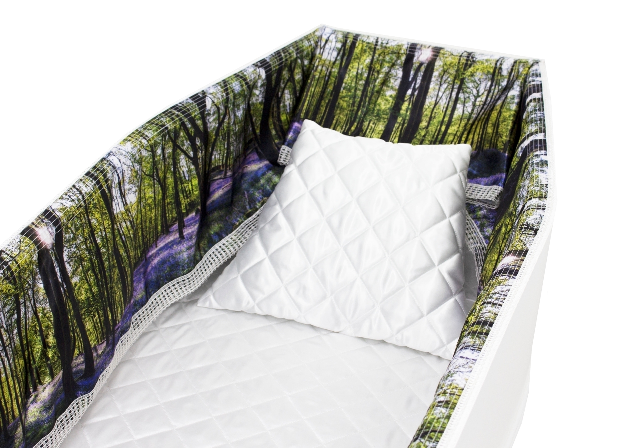 Luxury satin interior printed using water-based ink. The printed interior set consists of a 18-inch 2 Way printed satin frill, printed satin facecloth, quilted satin pillow and a quilted satin mattress.The chosen design will be printed on the interior. Image is to illustrate style of Interior Only.