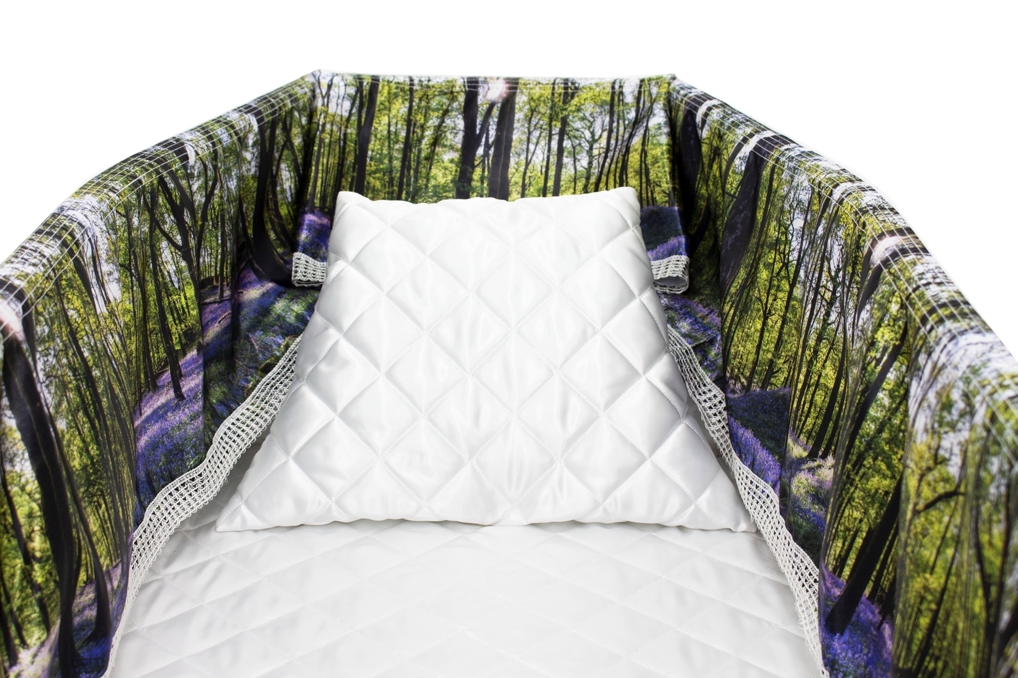 Luxury satin interior printed using water-based ink. The printed interior set consists of a 12-inch printed satin frill, printed satin facecloth, quilted satin pillow and a quilted satin mattress.