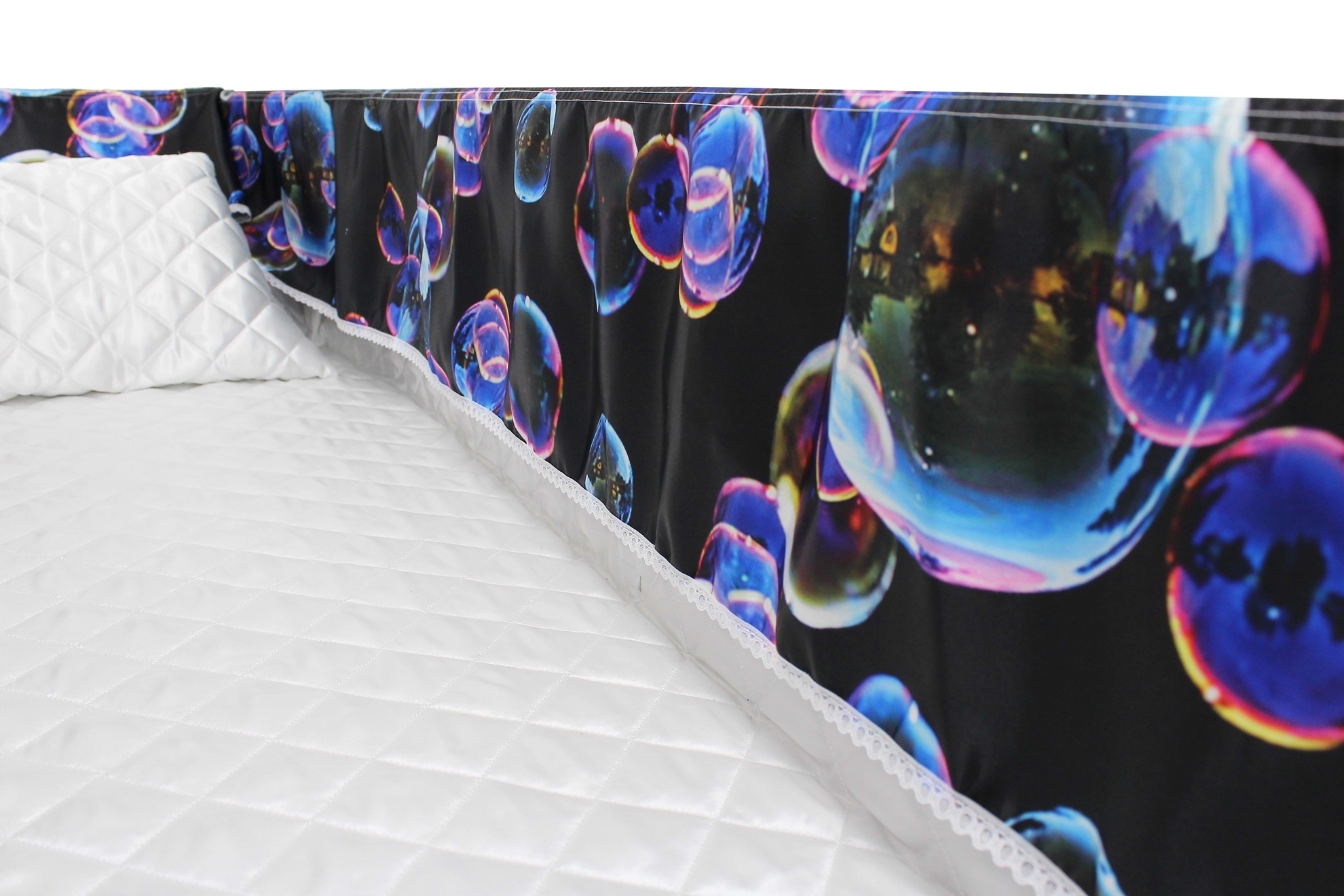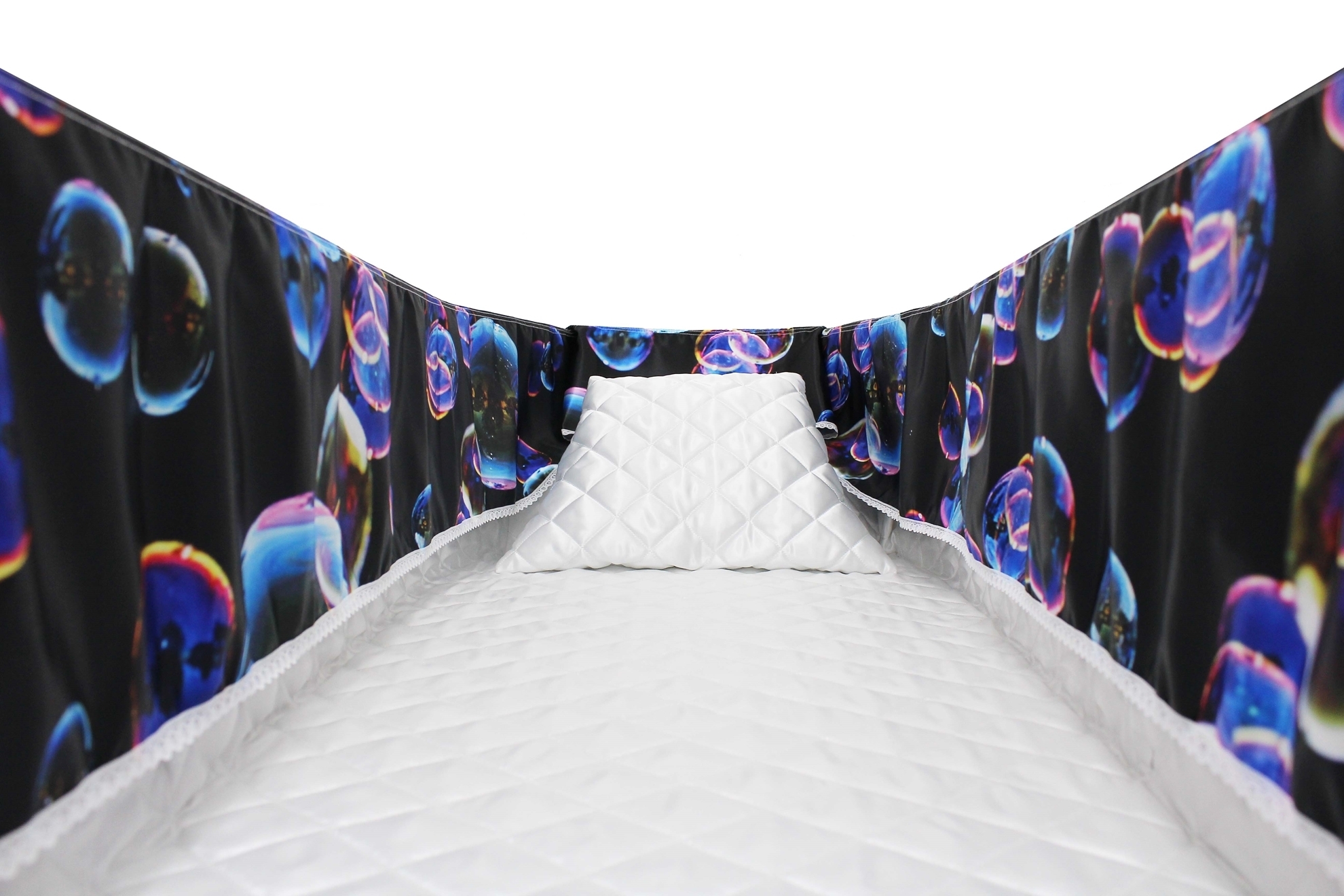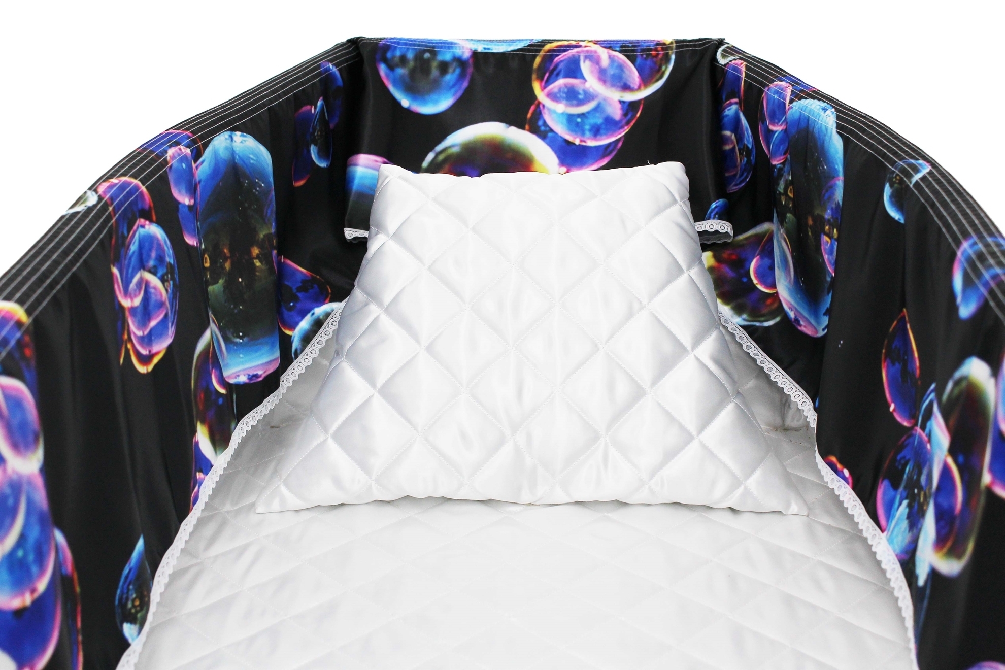 Luxury satin interiors printed using water-based ink. The interiors are designed, printed, and manufactured in our UK factory. The printed interior set consists of either a 6” or 9” printed satin frill (3.5m Length), printed satin facecloth, quilted satin pillow and a quilted satin mattress. Disclaimer: The colours are as accurate as the print process will allow.