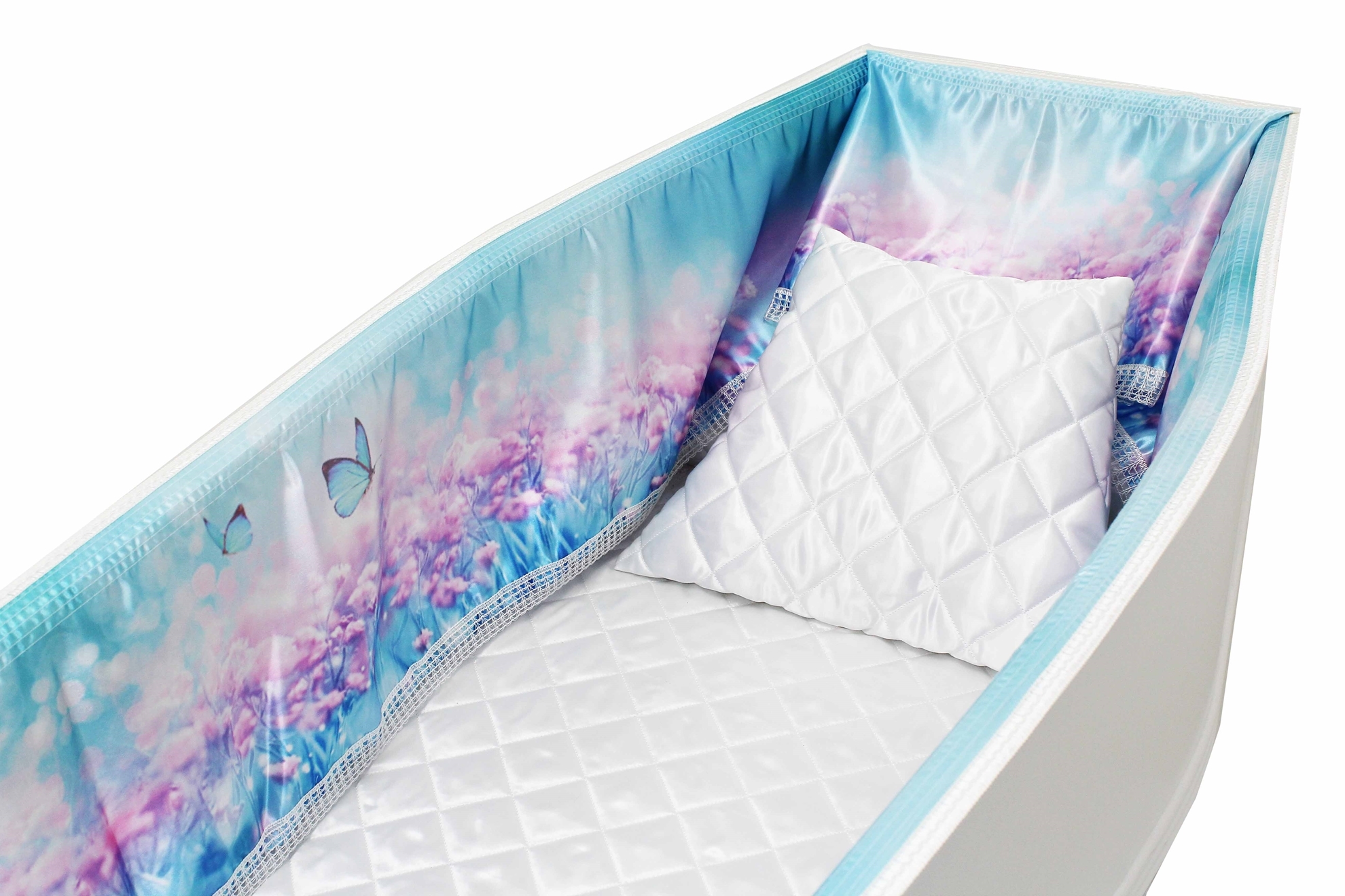 Luxury satin interior printed using water-based ink. The printed interior set consists of a 18-inch 2 Way printed satin frill, printed satin facecloth, quilted satin pillow and a quilted satin mattress.The chosen design will be printed on the interior. Image is to illustrate style of Interior Only.