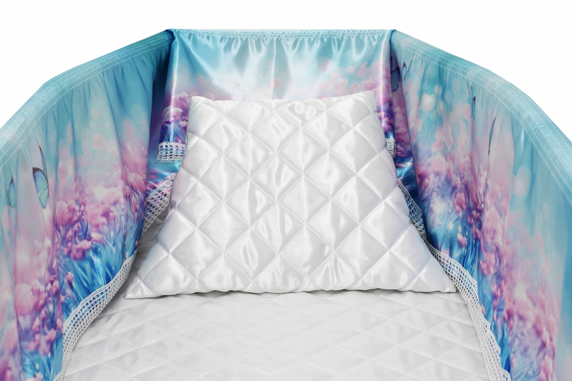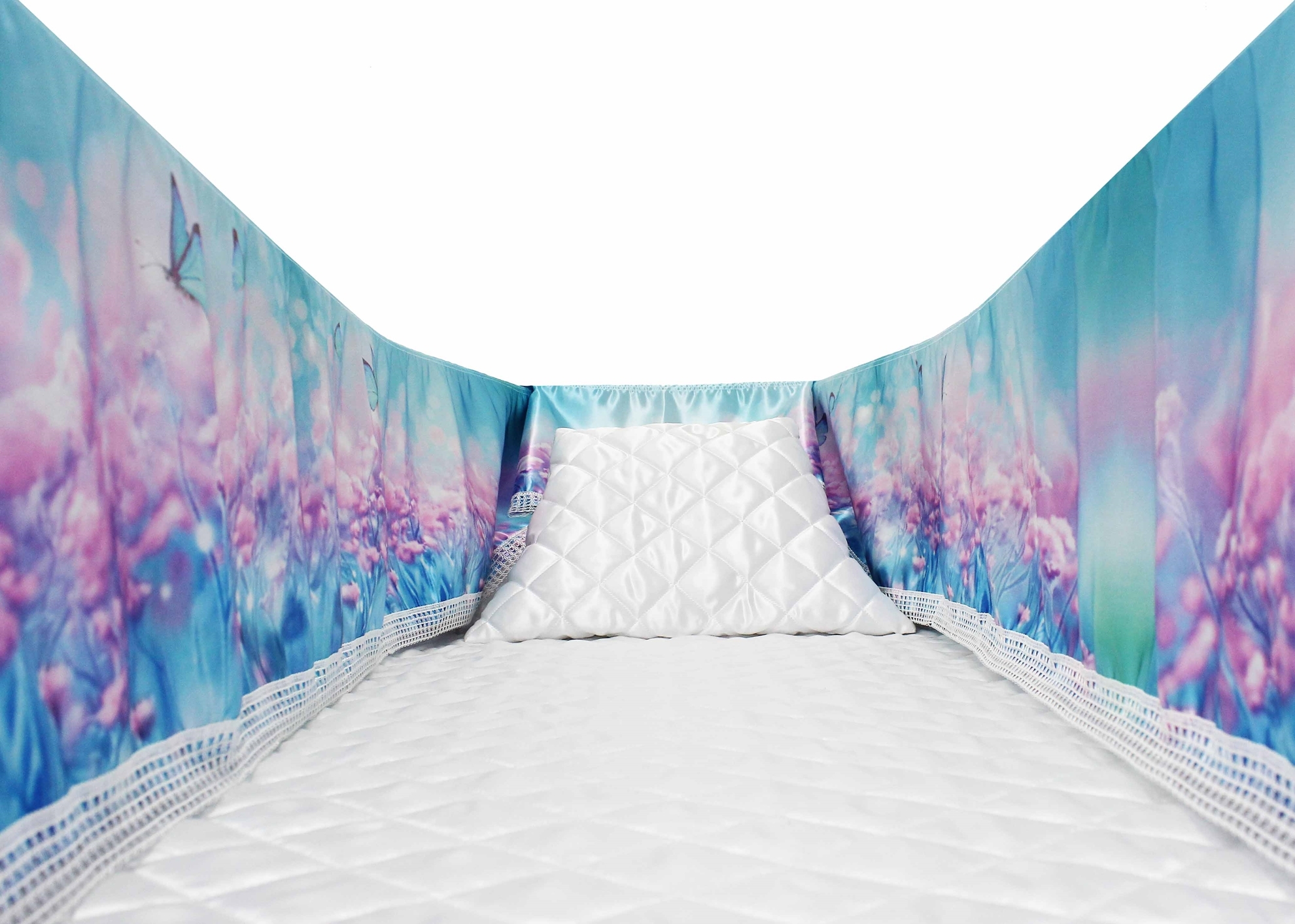 Luxury satin interior printed using water-based ink. The printed interior set consists of a 12-inch printed satin frill, printed satin facecloth, quilted satin pillow and a quilted satin mattress.