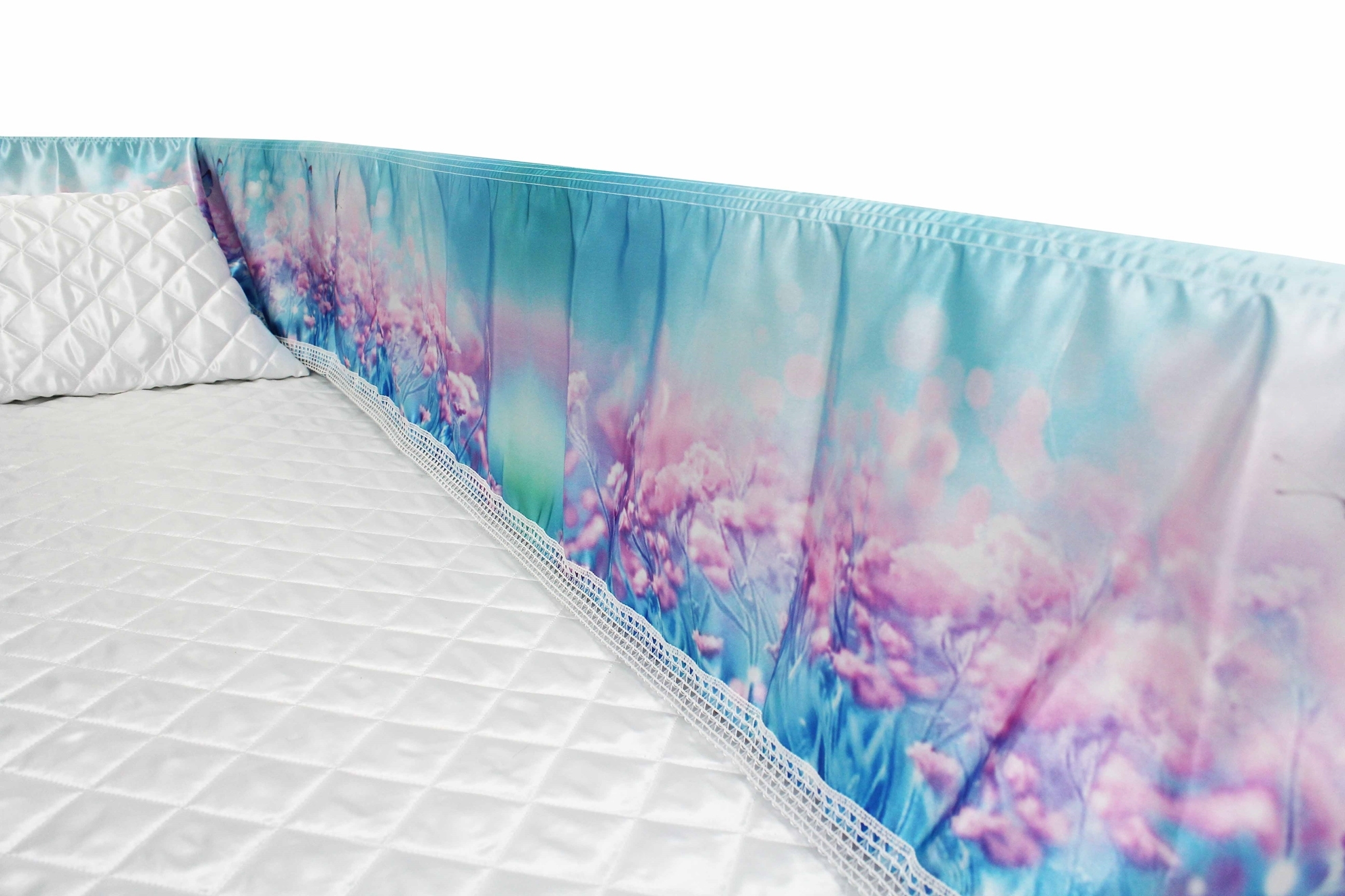 Luxury Satin 18-inch 2-way frill consisting of a 12-inch internal frill with an additional 6-inch exterior frill. The chosen design will be printed on the 18" 2-Way Frill. Please note the image shows a mattress and a pillow which are NOT included. Image is to illustrate style of Interior Only.