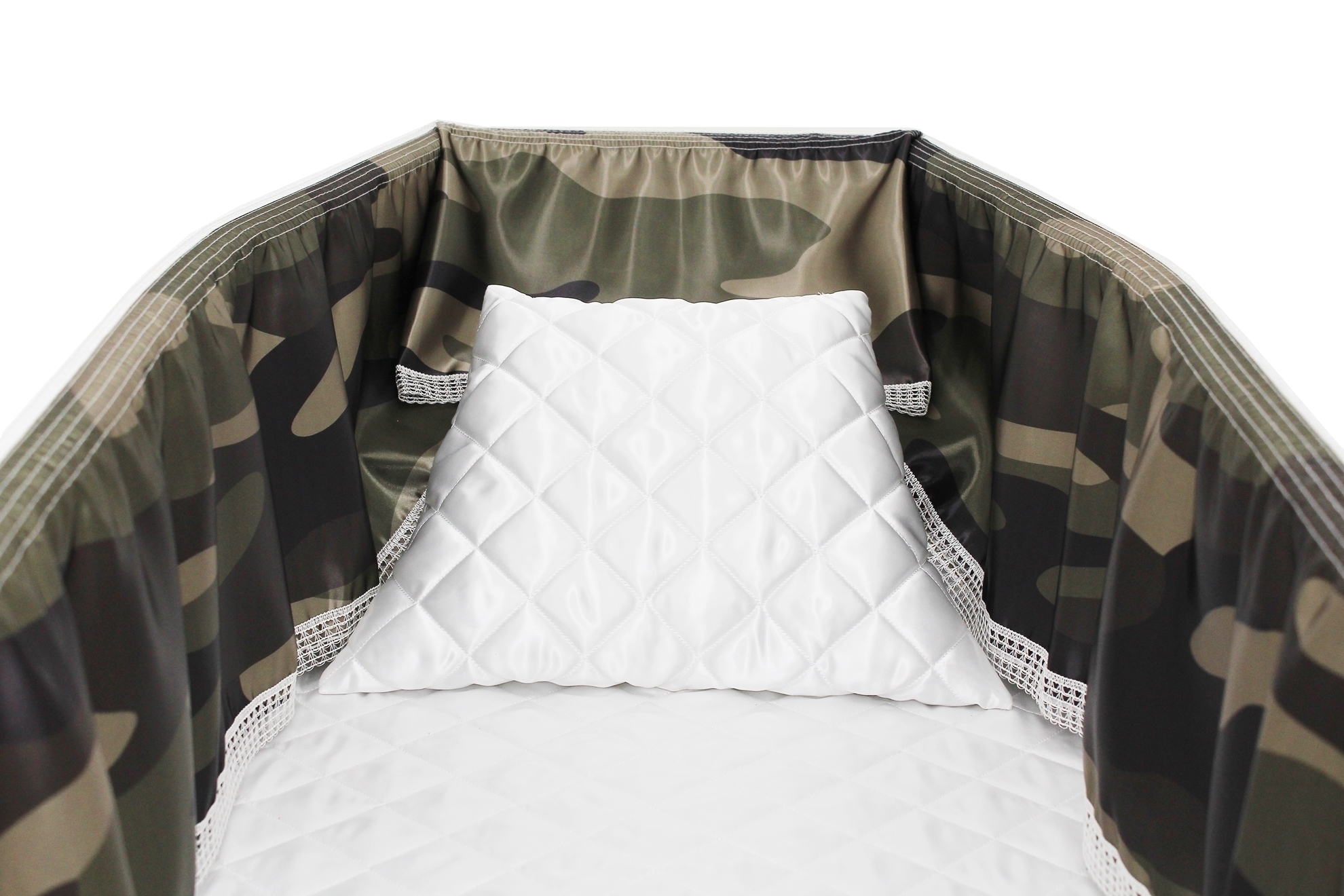 Luxury satin interior printed using water-based ink. The printed interior set consists of a 18-inch 2 Way printed satin frill, printed satin facecloth, quilted satin pillow and a quilted satin mattress.The chosen design will be printed on the interior. Image is to illustrate style of Interior Only.