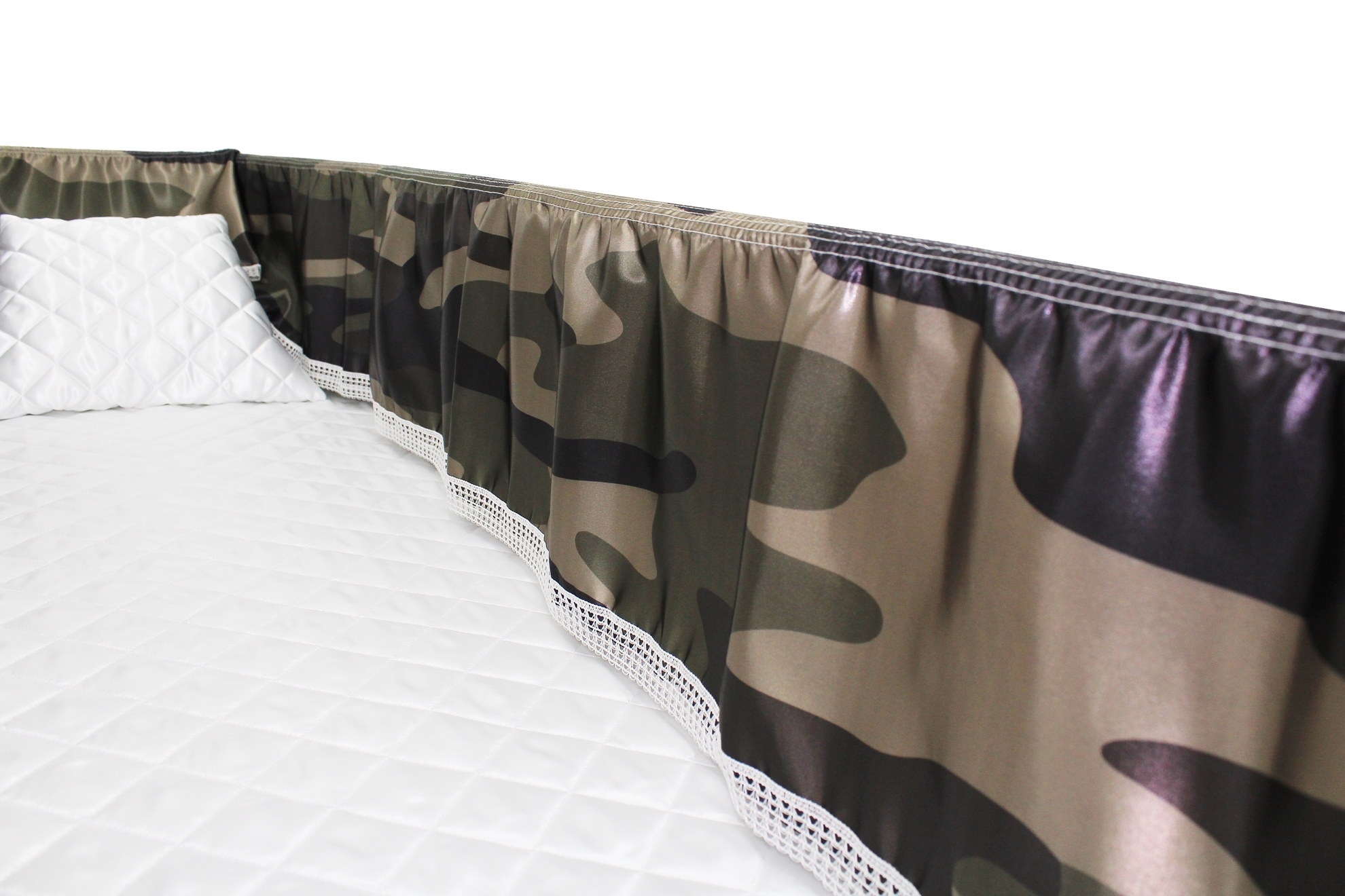 Luxury Satin 18-inch 2-way frill consisting of a 12-inch internal frill with an additional 6-inch exterior frill. The chosen design will be printed on the 18" 2-Way Frill. Please note the image shows a mattress and a pillow which are NOT included. Image is to illustrate style of Interior Only.