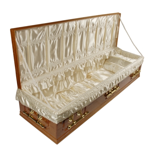 Top quality full satin suite for caskets. Comes complete with gown, padded pillow, 12" frill, puff ruffle, coverlet, interior lid piece all in satin.