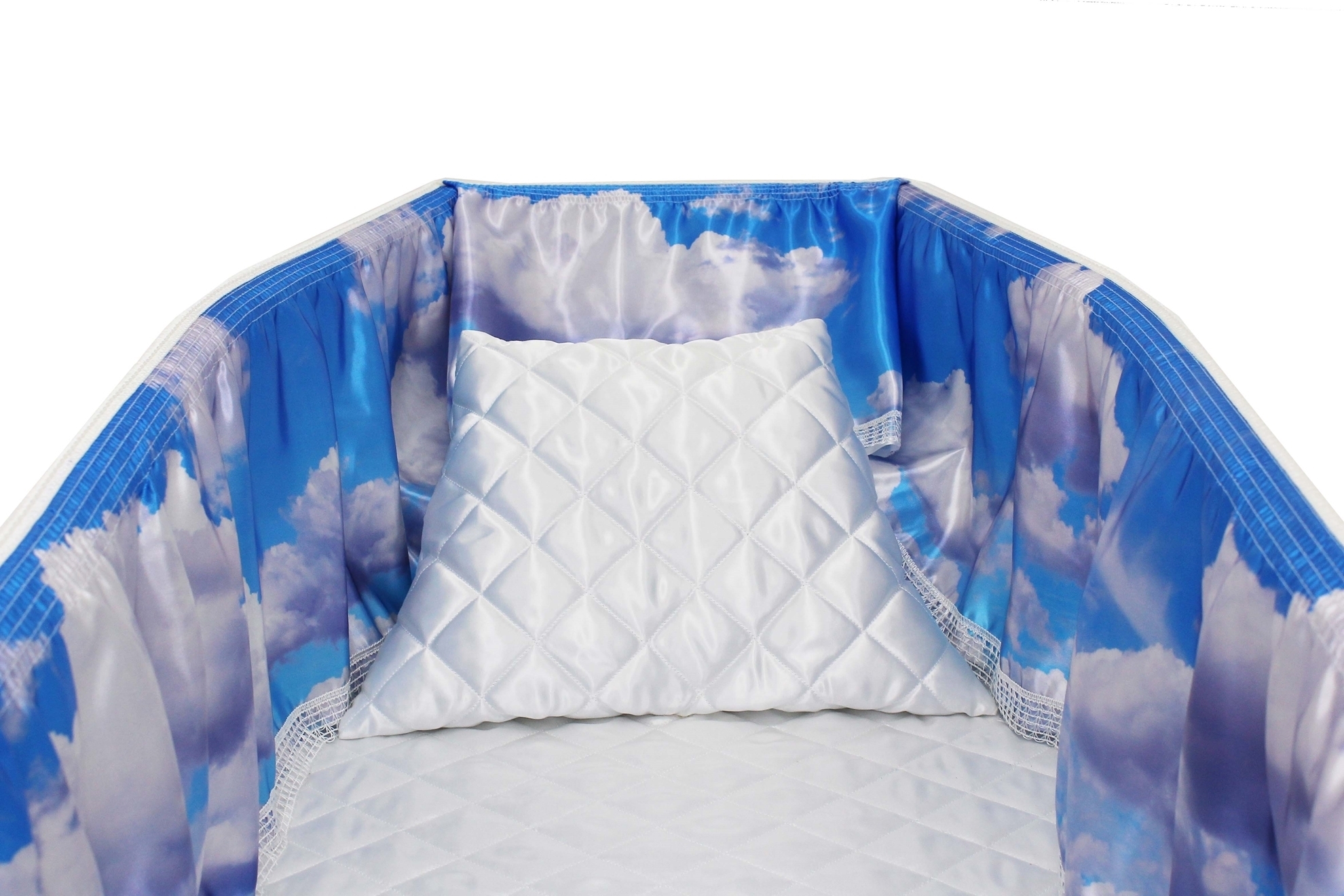 Luxury satin interior printed using water-based ink. The printed interior set consists of a 12-inch printed satin frill, printed satin facecloth, quilted satin pillow and a quilted satin mattress.