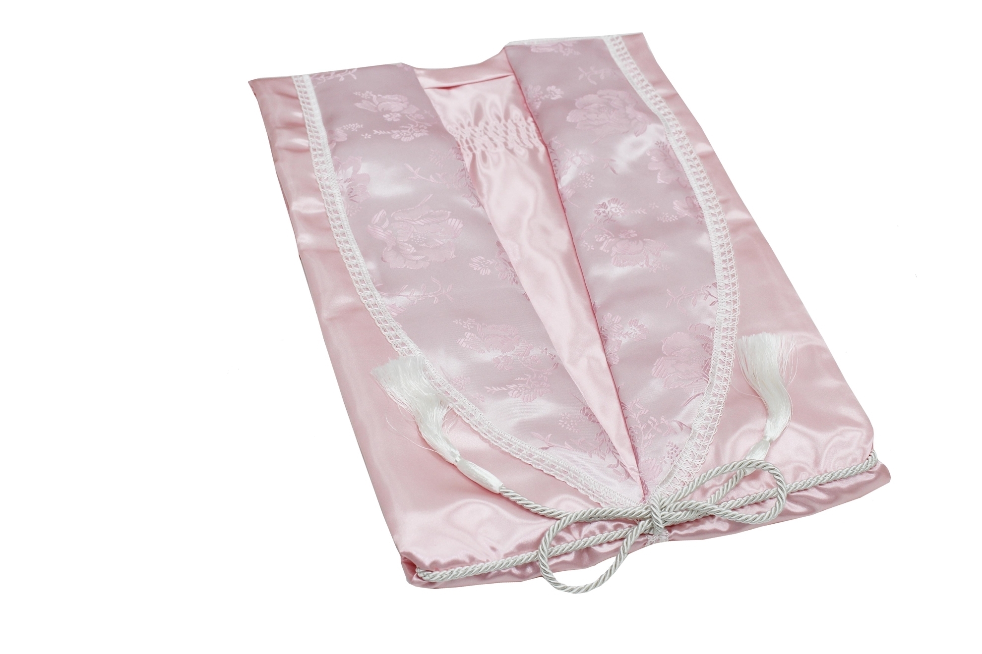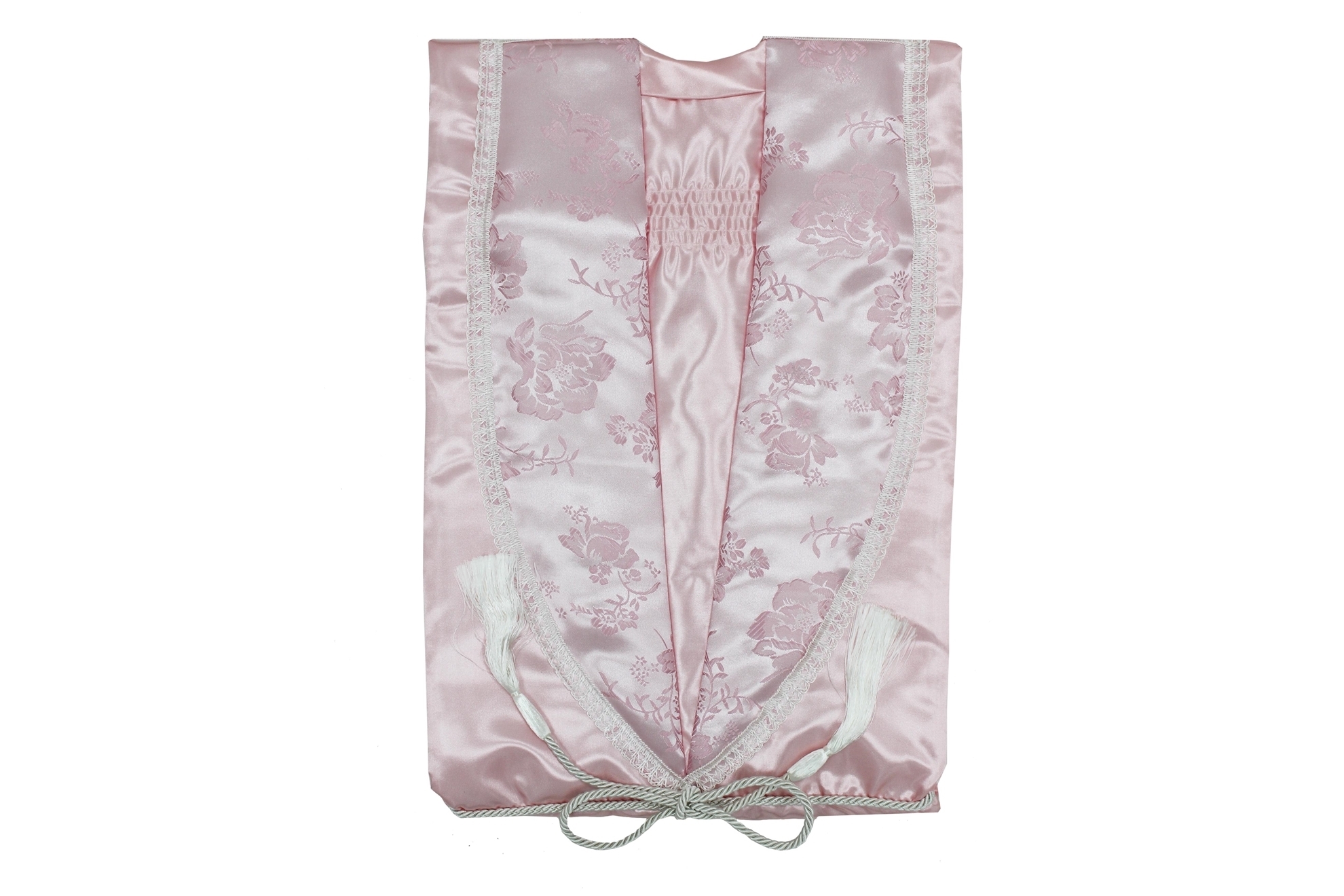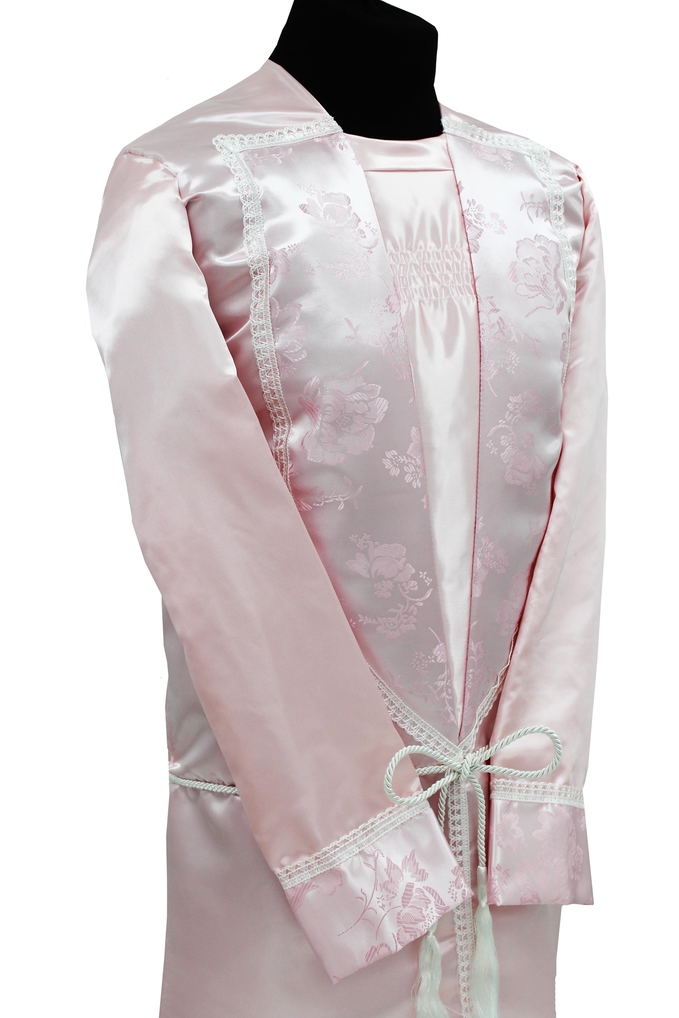 Satin 602 Gown with a High Sheen Finish and Decorative Floral Lapel and Cuff.  Available in: Blue, Bottle Green, Cream, Lilac, Mint Green, Oyster, Peach, Pink, Red, Silver/Grey and White with an option of a 9" or 12" Frill.