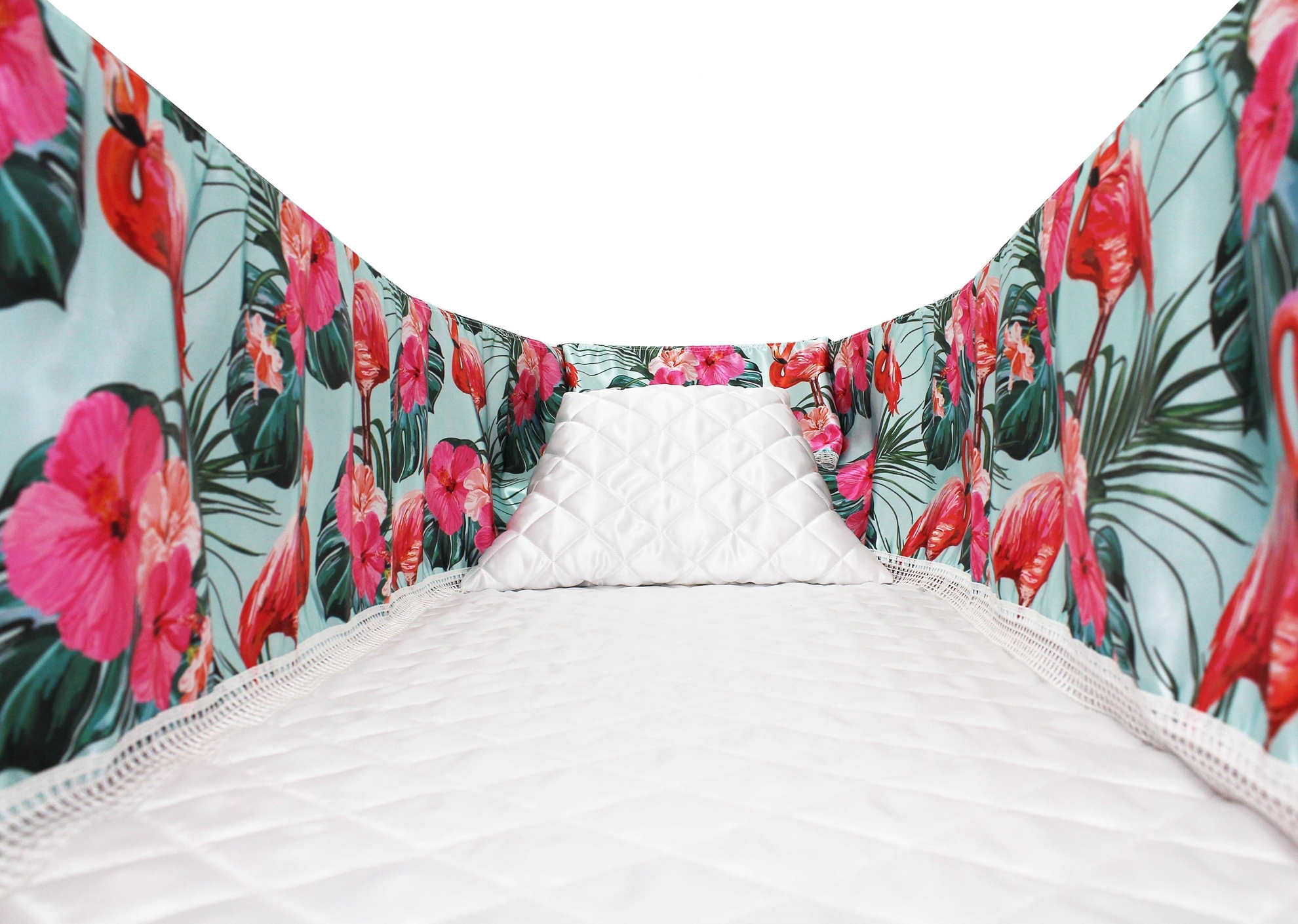Luxury Satin 18-inch 2-way frill consisting of a 12-inch internal frill with an additional 6-inch exterior frill. The chosen design will be printed on the 18" 2-Way Frill. Please note the image shows a mattress and a pillow which are NOT included. Image is to illustrate style of Interior Only.