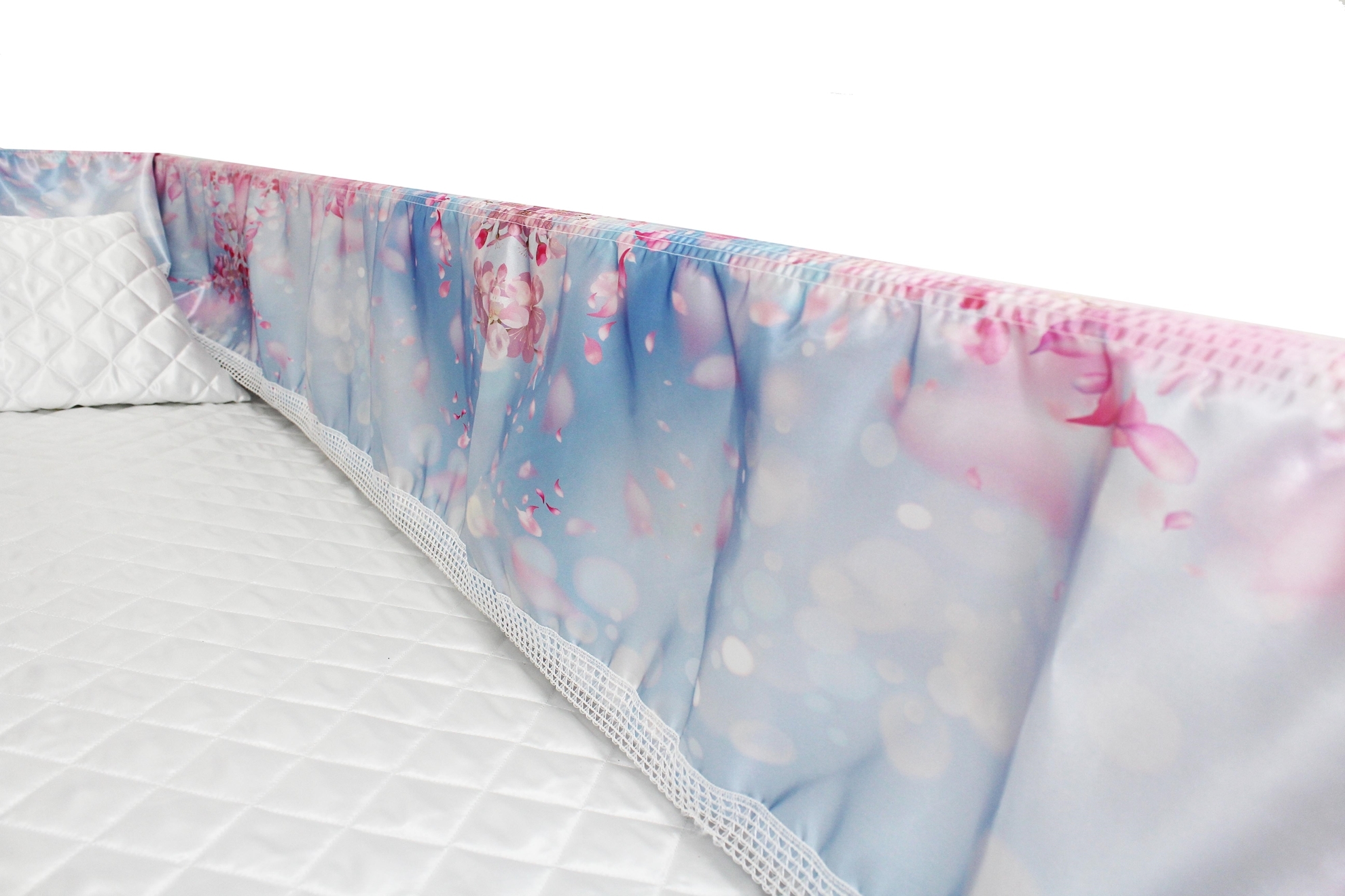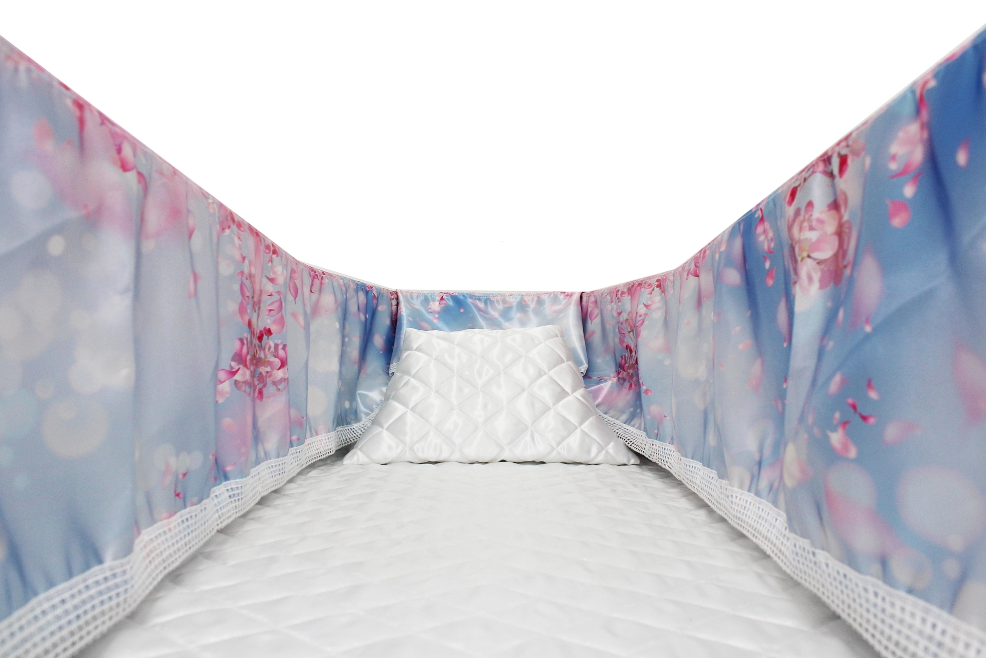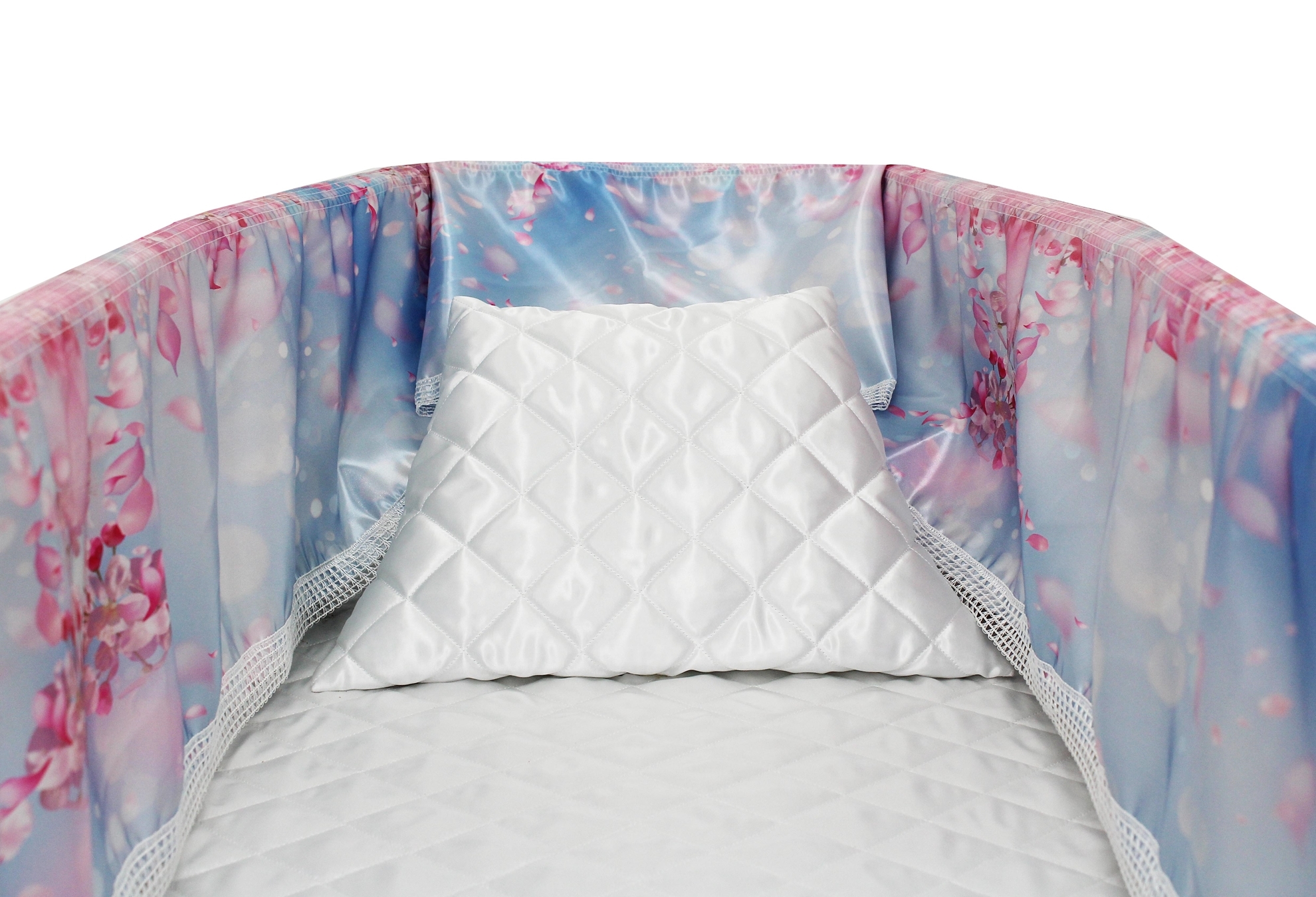 Luxury Satin 18-inch 2-way frill consisting of a 12-inch internal frill with an additional 6-inch exterior frill. The chosen design will be printed on the 18" 2-Way Frill. Please note the image shows a mattress and a pillow which are NOT included. Image is to illustrate style of Interior Only.