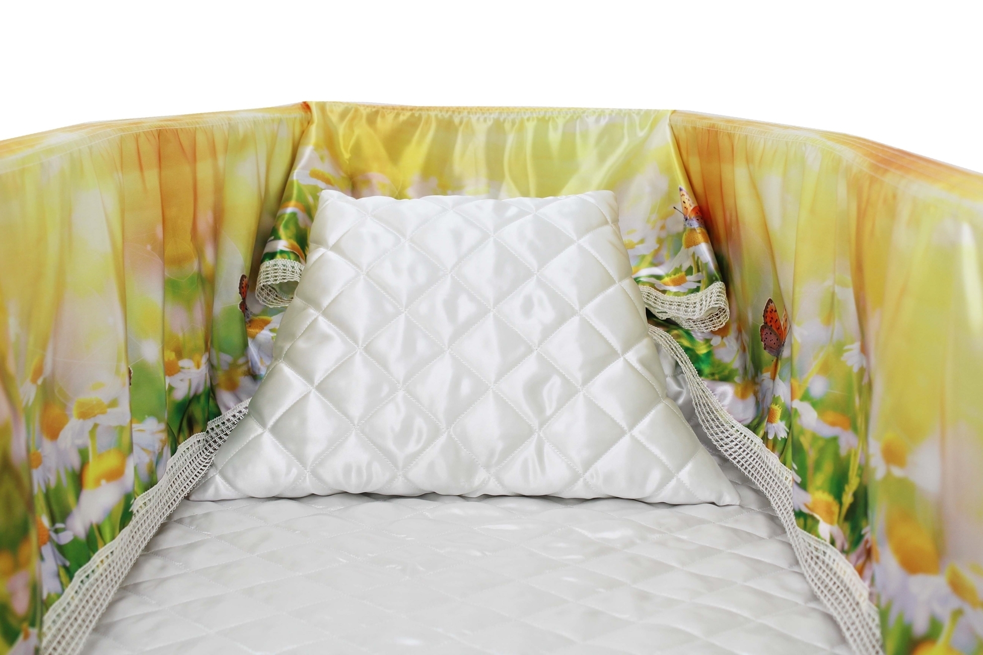 Luxury satin interior printed using water-based ink. The printed interior set consists of a 12-inch printed satin frill, printed satin facecloth, quilted satin pillow and a quilted satin mattress.