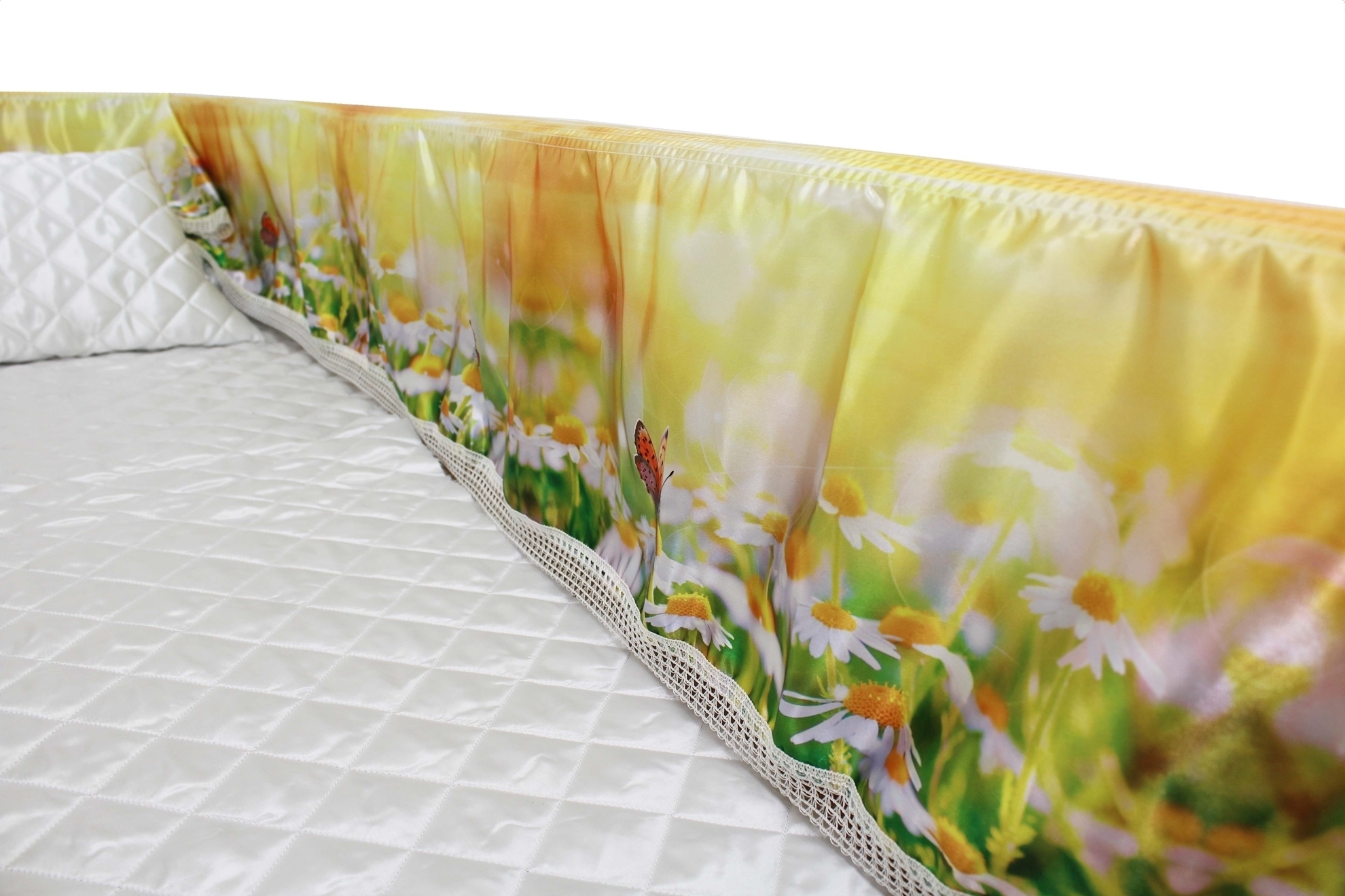 Luxury Satin 18-inch 2-way frill consisting of a 12-inch internal frill with an additional 6-inch exterior frill. The chosen design will be printed on the 18" 2-Way Frill. Please note the image shows a mattress and a pillow which are NOT included. Image is to illustrate style of Interior Only.