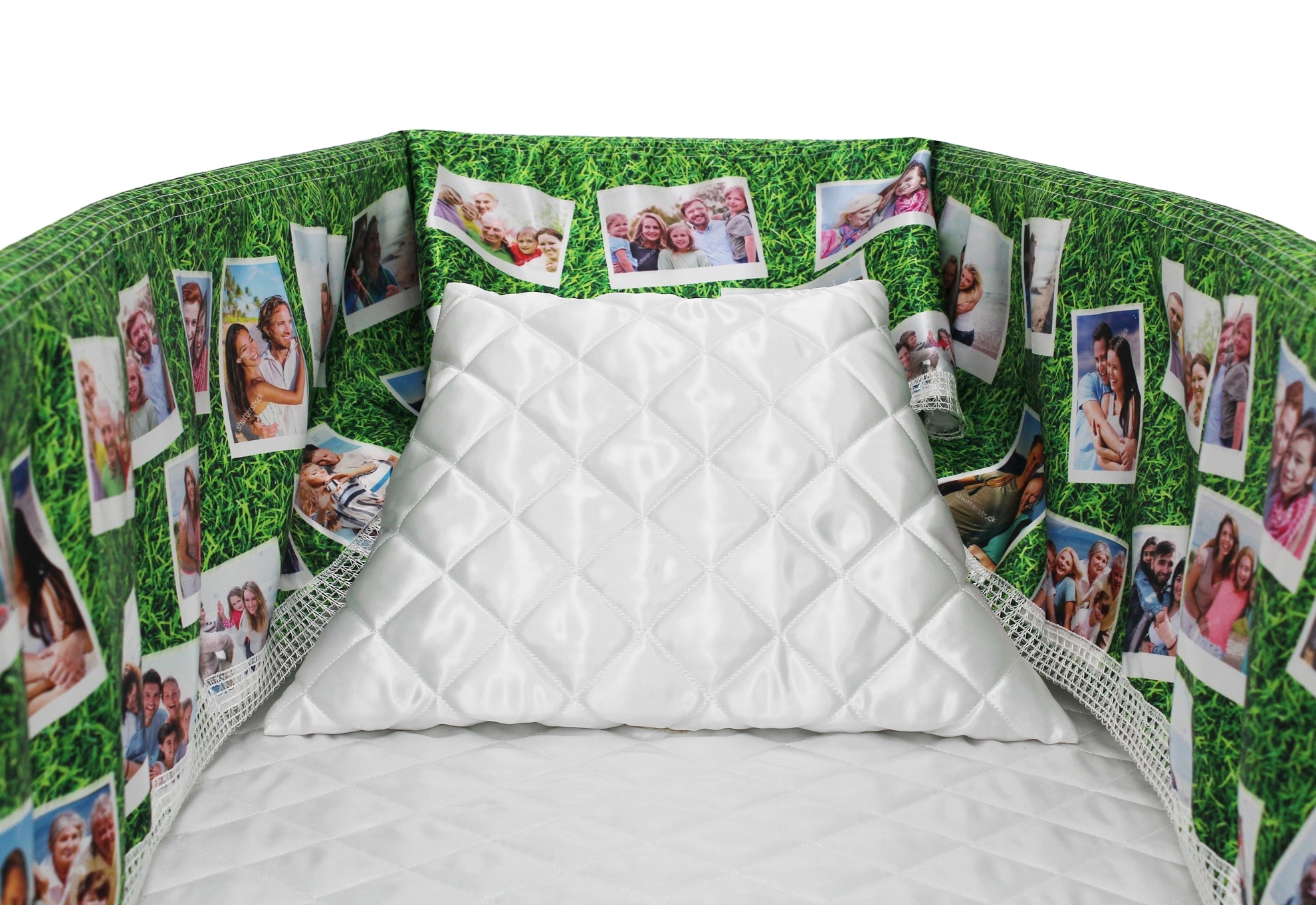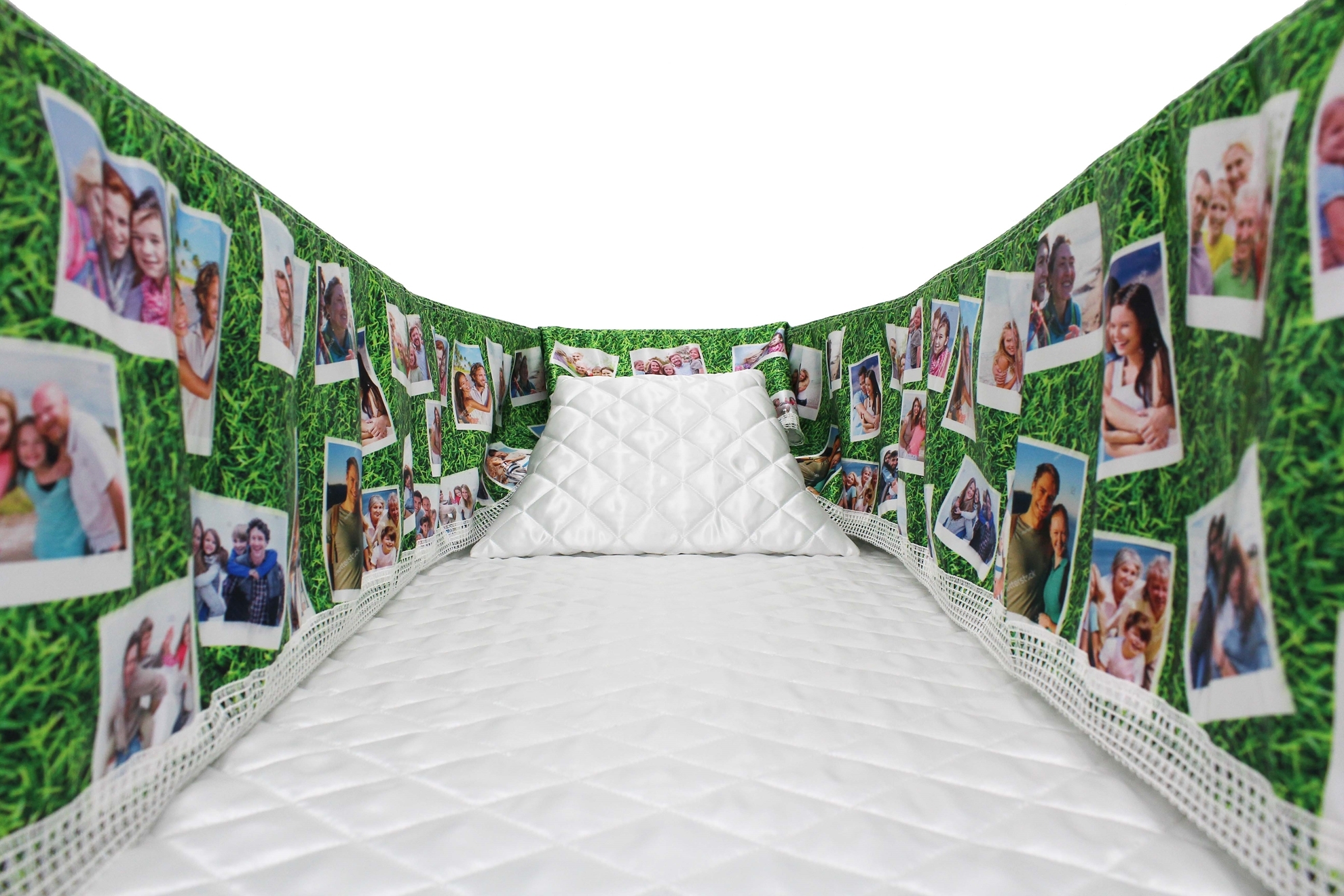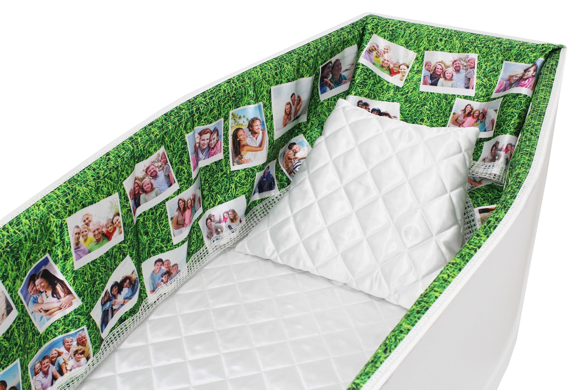 Luxury satin interior printed using water-based ink. The printed interior set consists of a 18-inch 2 Way printed satin frill, printed satin facecloth, quilted satin pillow and a quilted satin mattress.The chosen design will be printed on the interior. Image is to illustrate style of Interior Only.