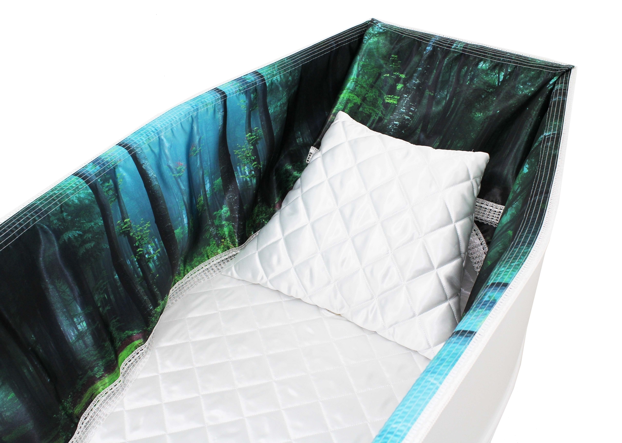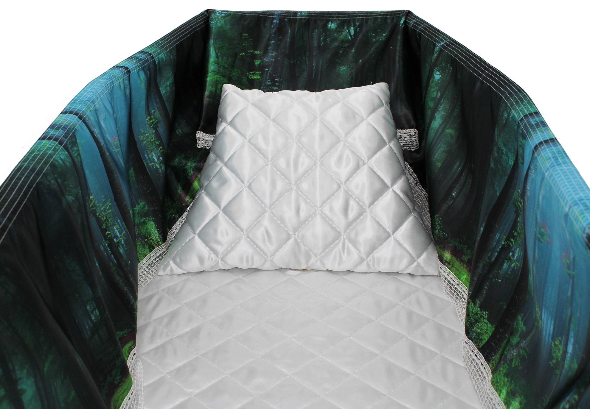 Luxury satin interior printed using water-based ink. The printed interior set consists of a 18-inch 2 Way printed satin frill, printed satin facecloth, quilted satin pillow and a quilted satin mattress.The chosen design will be printed on the interior. Image is to illustrate style of Interior Only.