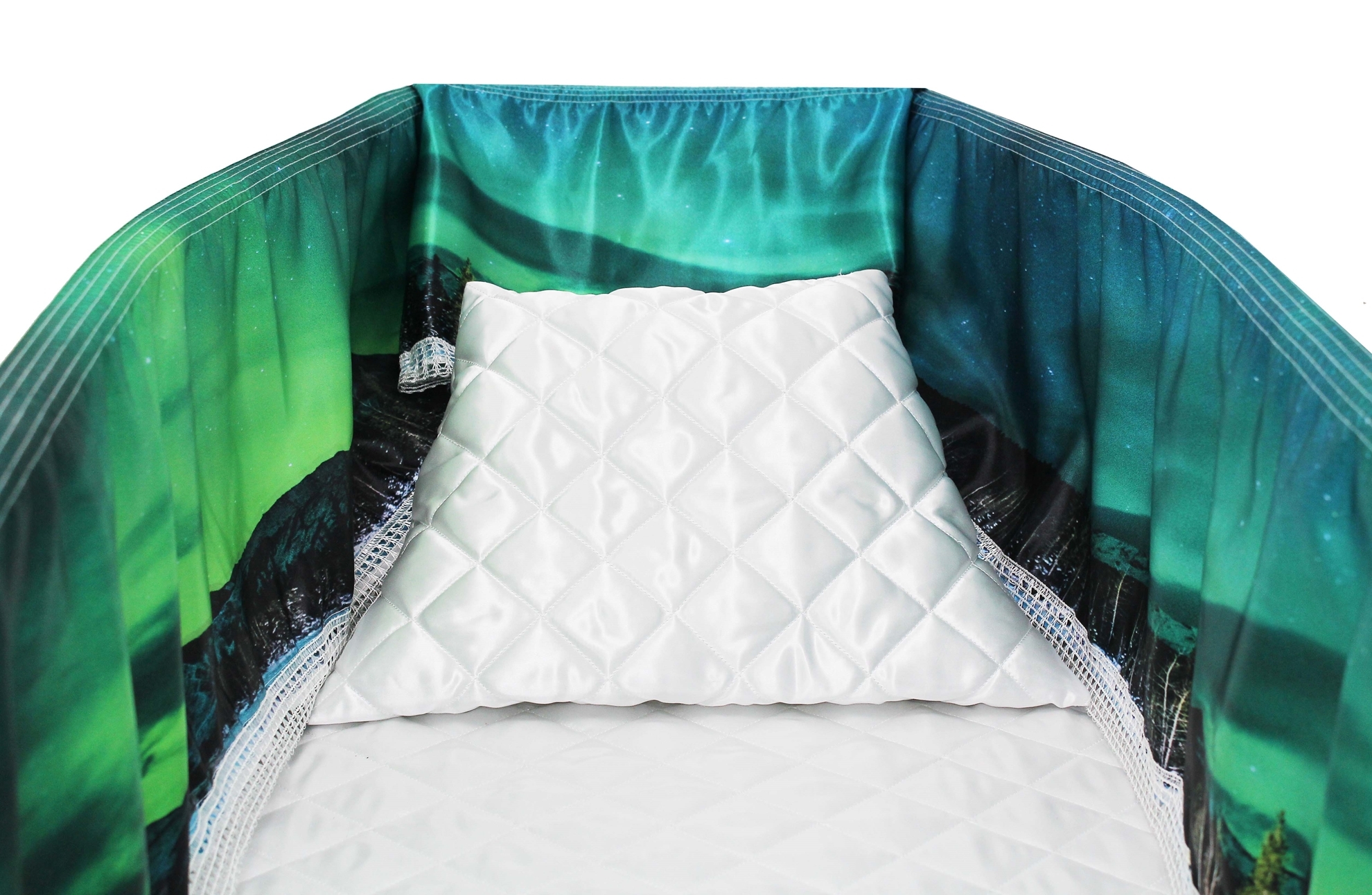 Luxury satin interior printed using water-based ink. The printed interior set consists of a 18-inch 2 Way printed satin frill, printed satin facecloth, quilted satin pillow and a quilted satin mattress.The chosen design will be printed on the interior. Image is to illustrate style of Interior Only.