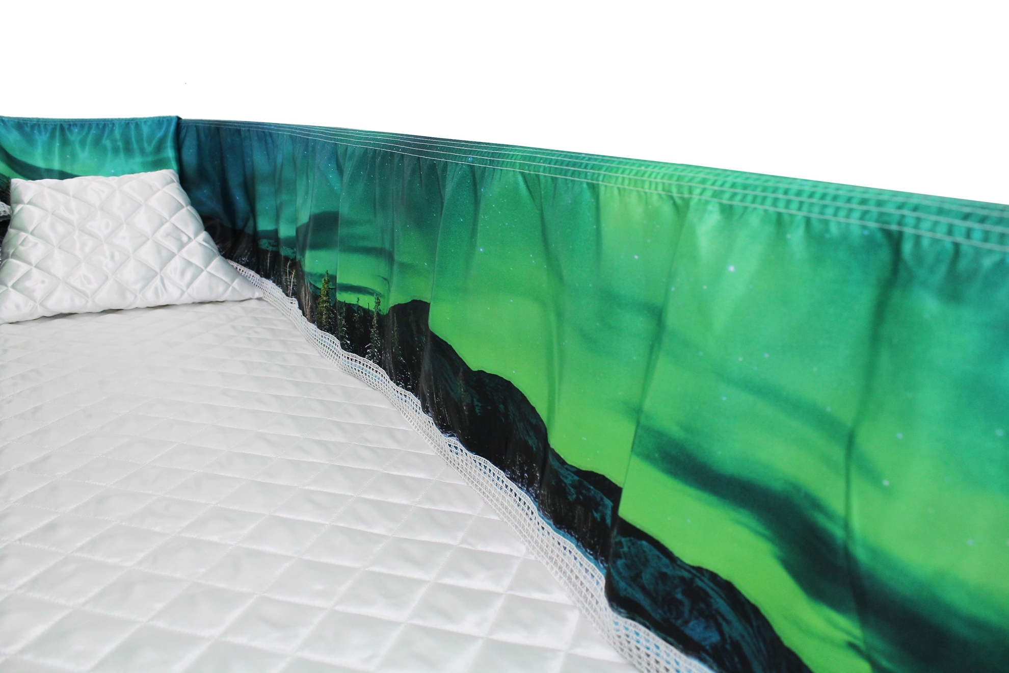 Luxury Satin 18-inch 2-way frill consisting of a 12-inch internal frill with an additional 6-inch exterior frill. The chosen design will be printed on the 18" 2-Way Frill. Please note the image shows a mattress and a pillow which are NOT included. Image is to illustrate style of Interior Only.