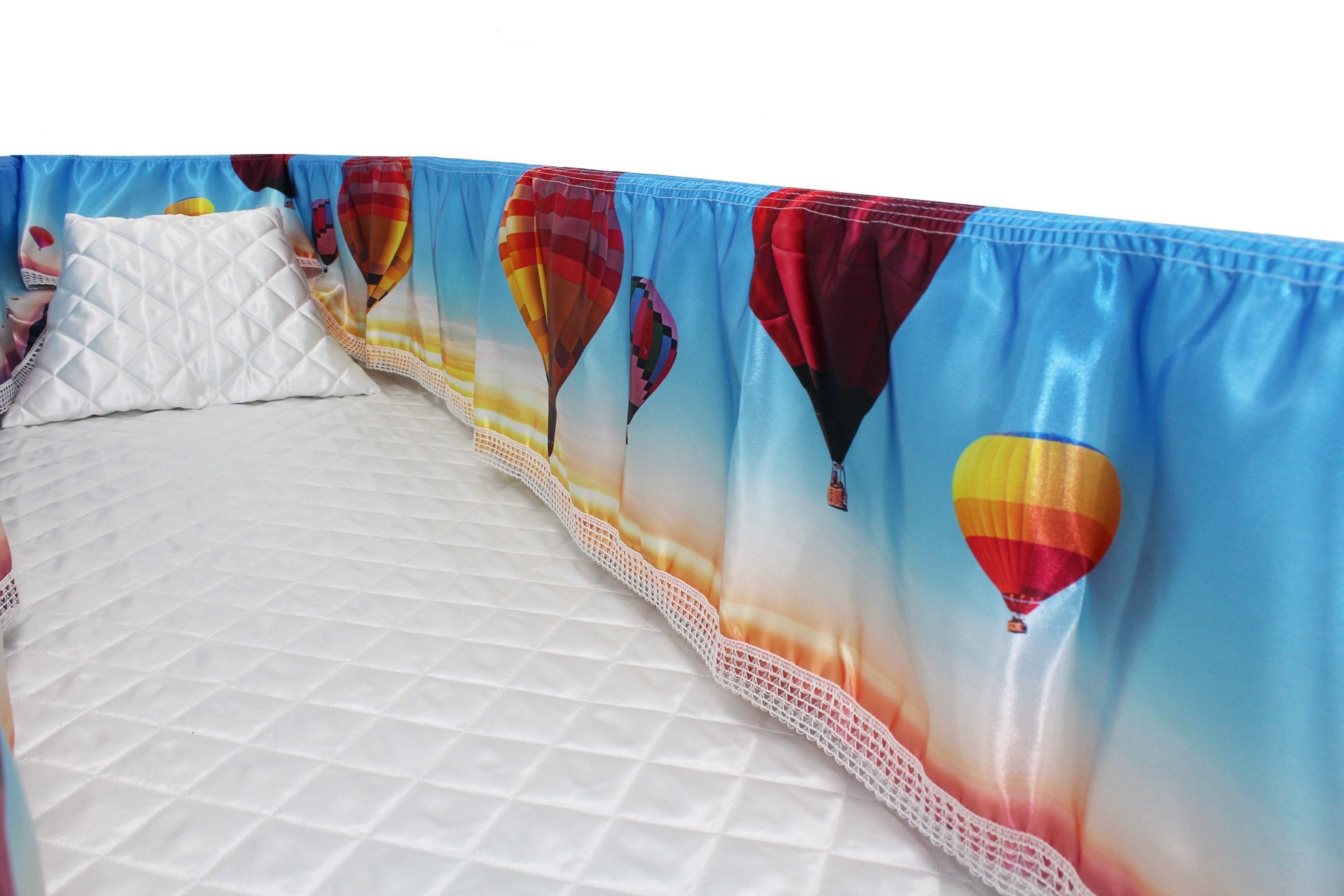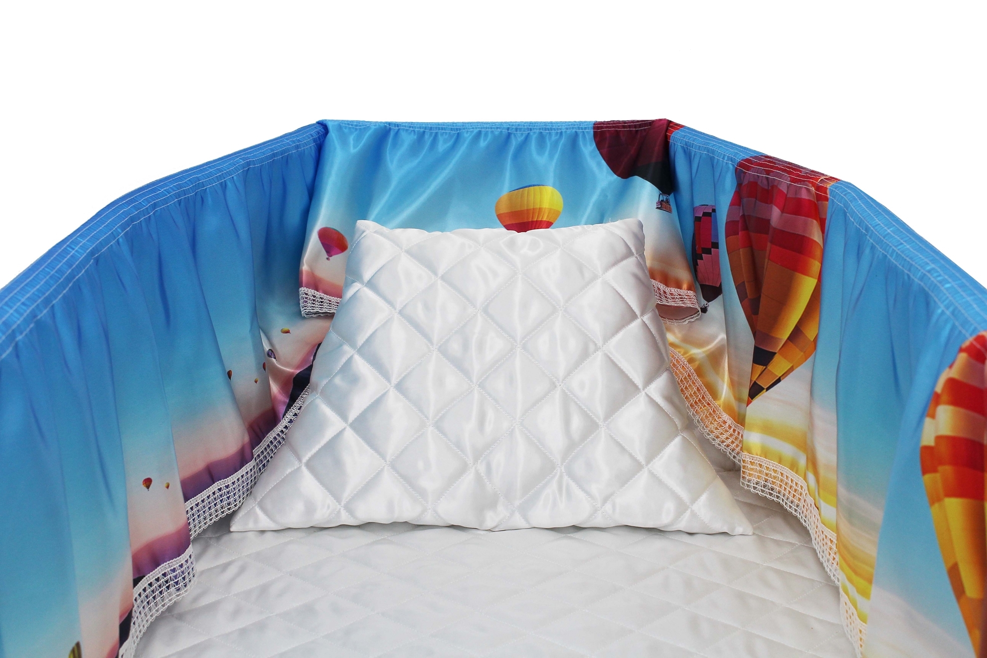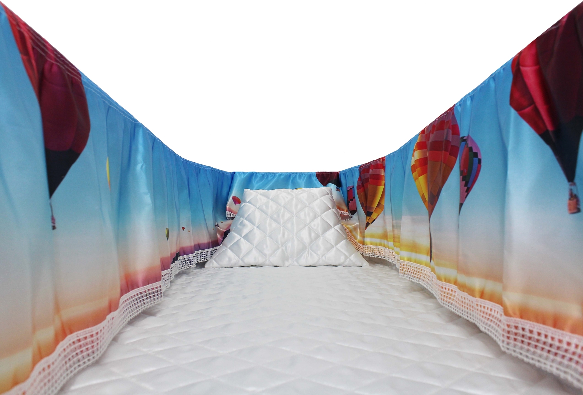 Luxury Satin 18-inch 2-way frill consisting of a 12-inch internal frill with an additional 6-inch exterior frill. The chosen design will be printed on the 18" 2-Way Frill. Please note the image shows a mattress and a pillow which are NOT included. Image is to illustrate style of Interior Only.