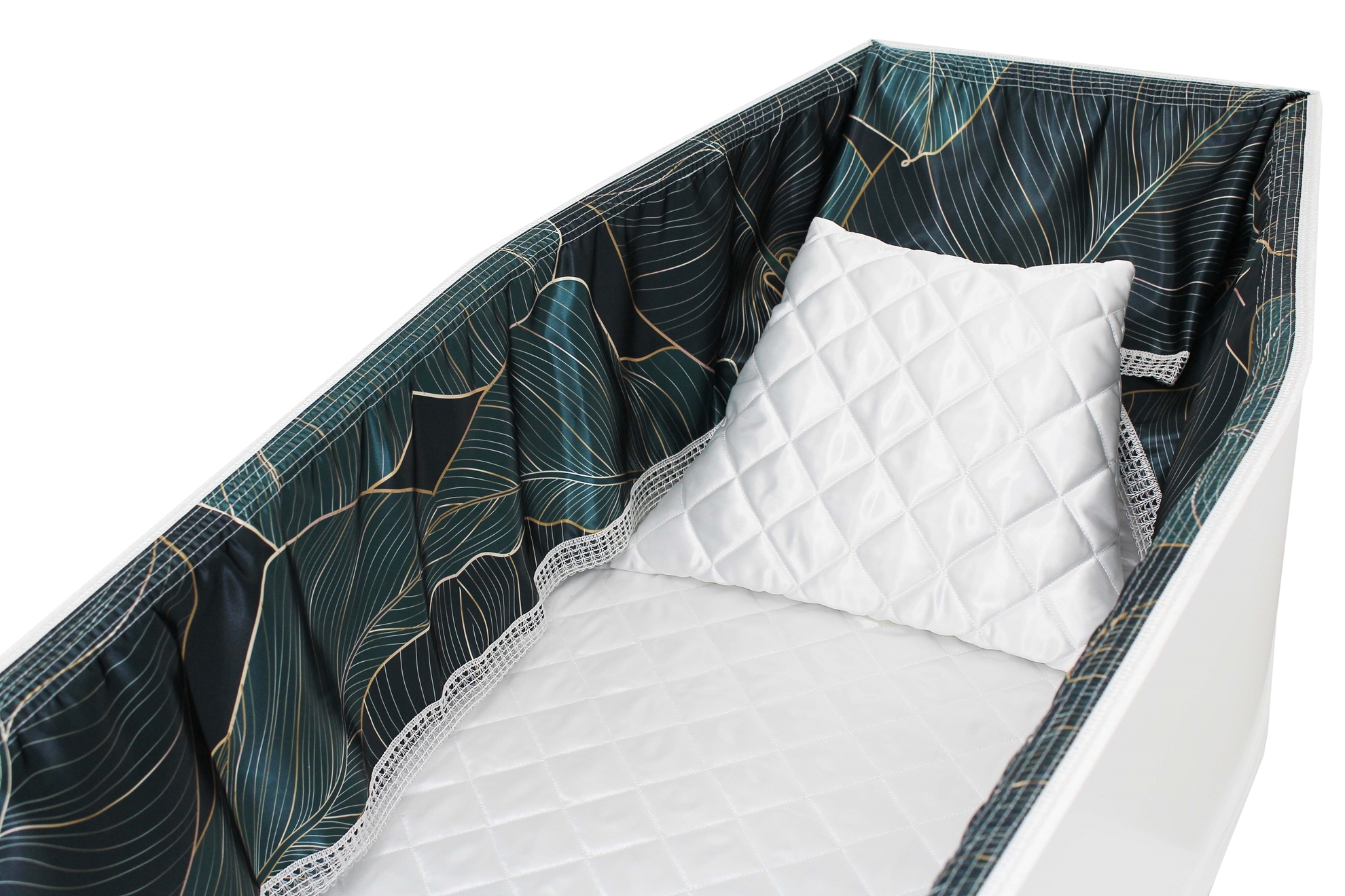 Luxury satin interior printed using water-based ink. The printed interior set consists of a 18-inch 2 Way printed satin frill, printed satin facecloth, quilted satin pillow and a quilted satin mattress.The chosen design will be printed on the interior. Image is to illustrate style of Interior Only.