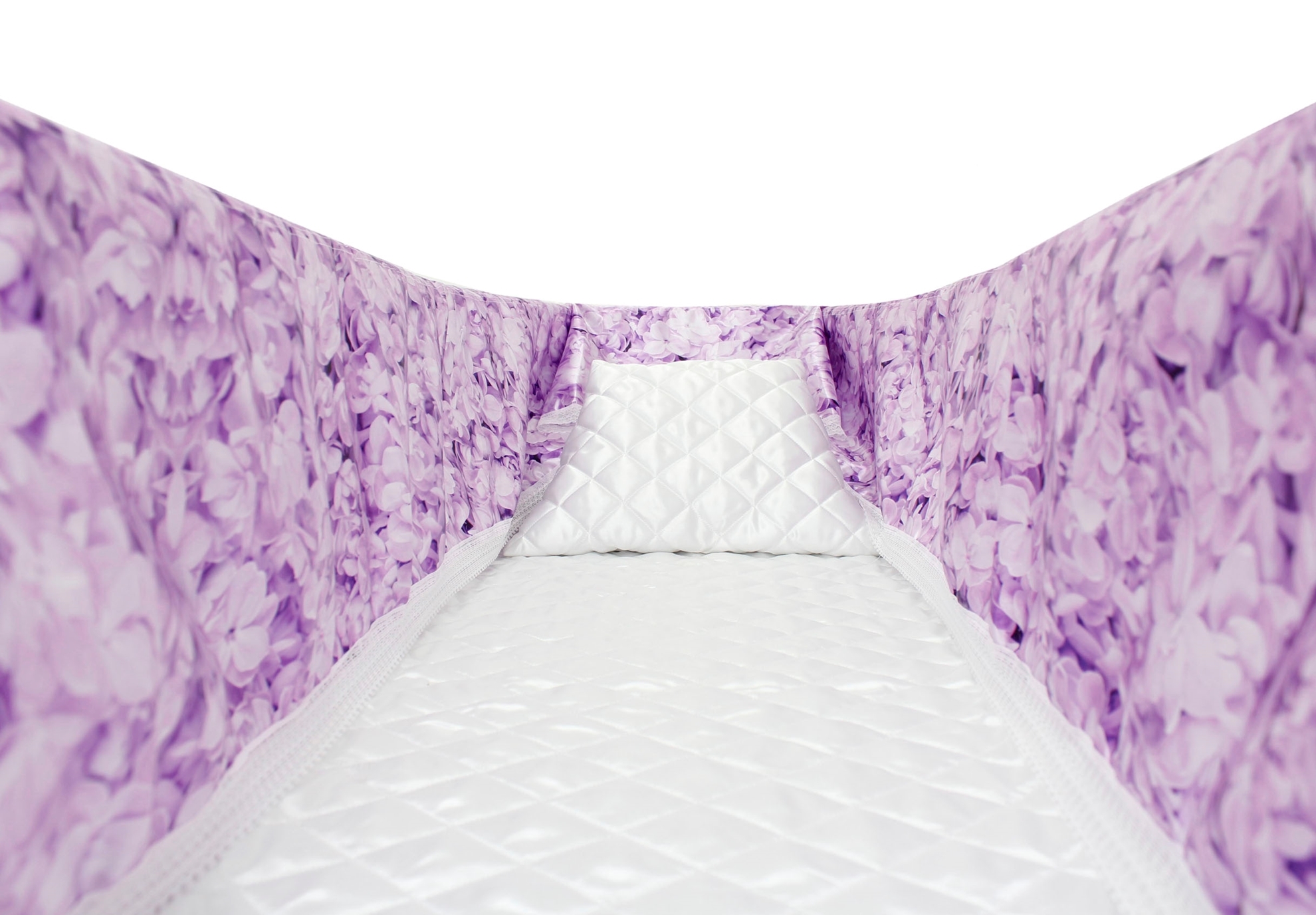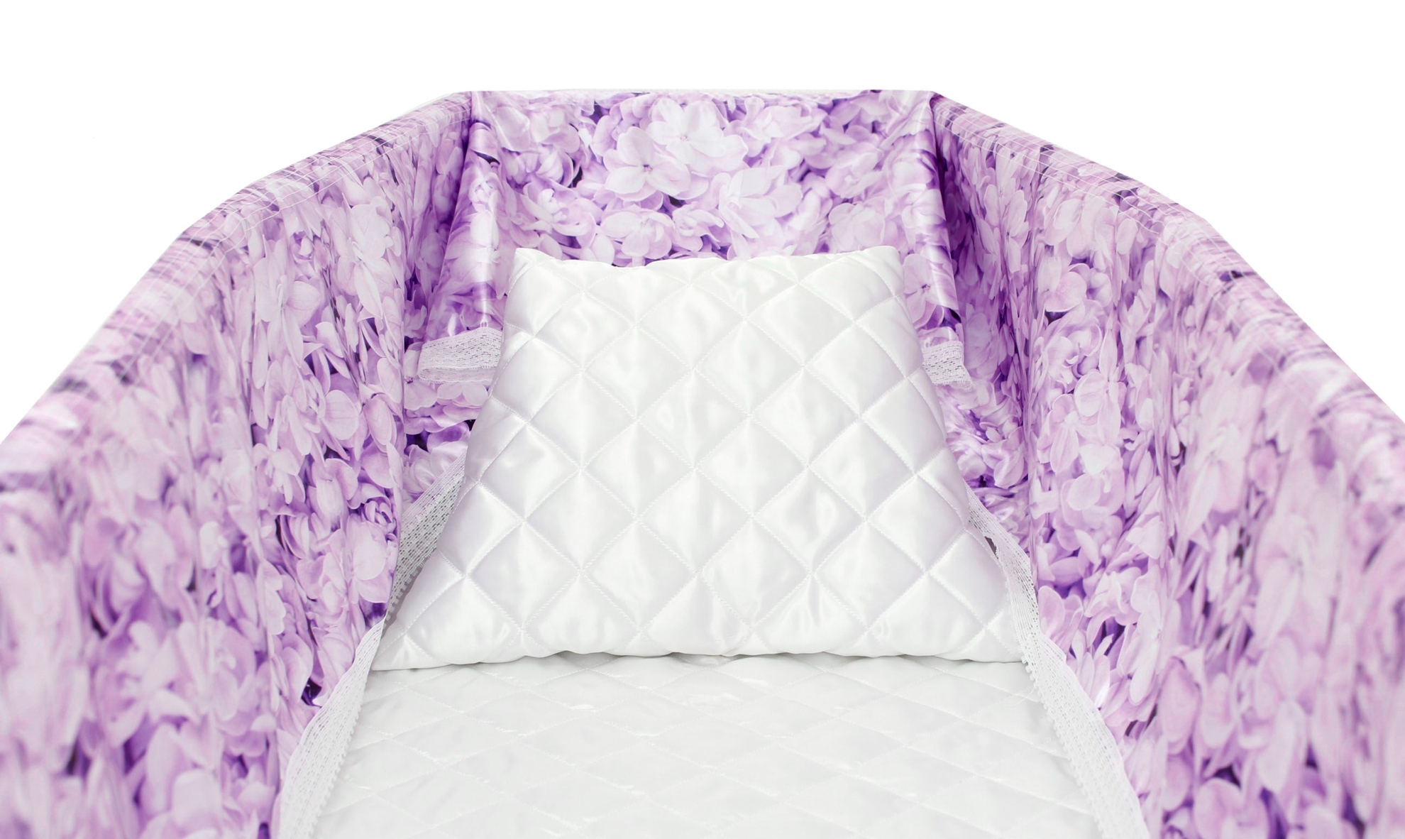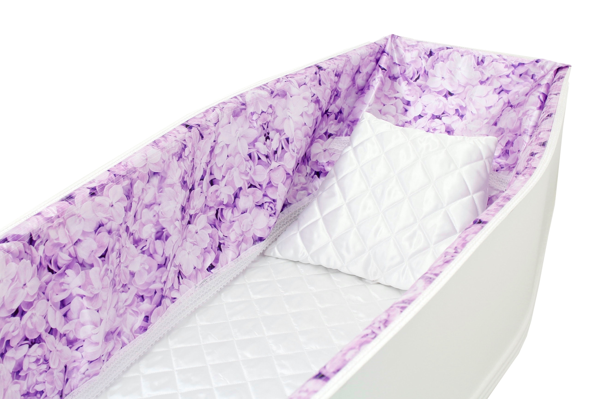 Luxury satin interior printed using water-based ink. The printed interior set consists of a 12-inch printed satin frill, printed satin facecloth, quilted satin pillow and a quilted satin mattress.