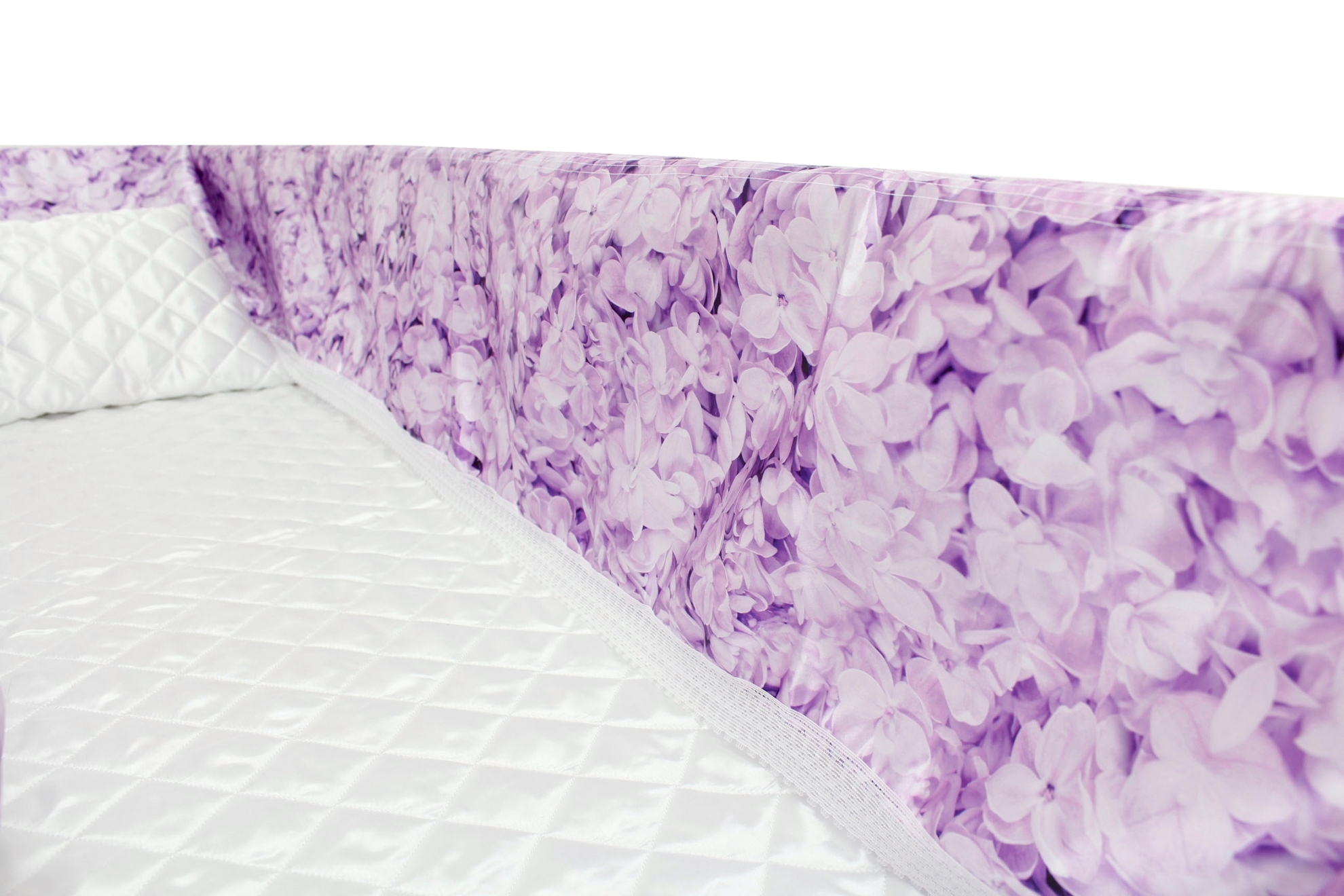 Luxury Satin 18-inch 2-way frill consisting of a 12-inch internal frill with an additional 6-inch exterior frill. The chosen design will be printed on the 18" 2-Way Frill. Please note the image shows a mattress and a pillow which are NOT included. Image is to illustrate style of Interior Only.