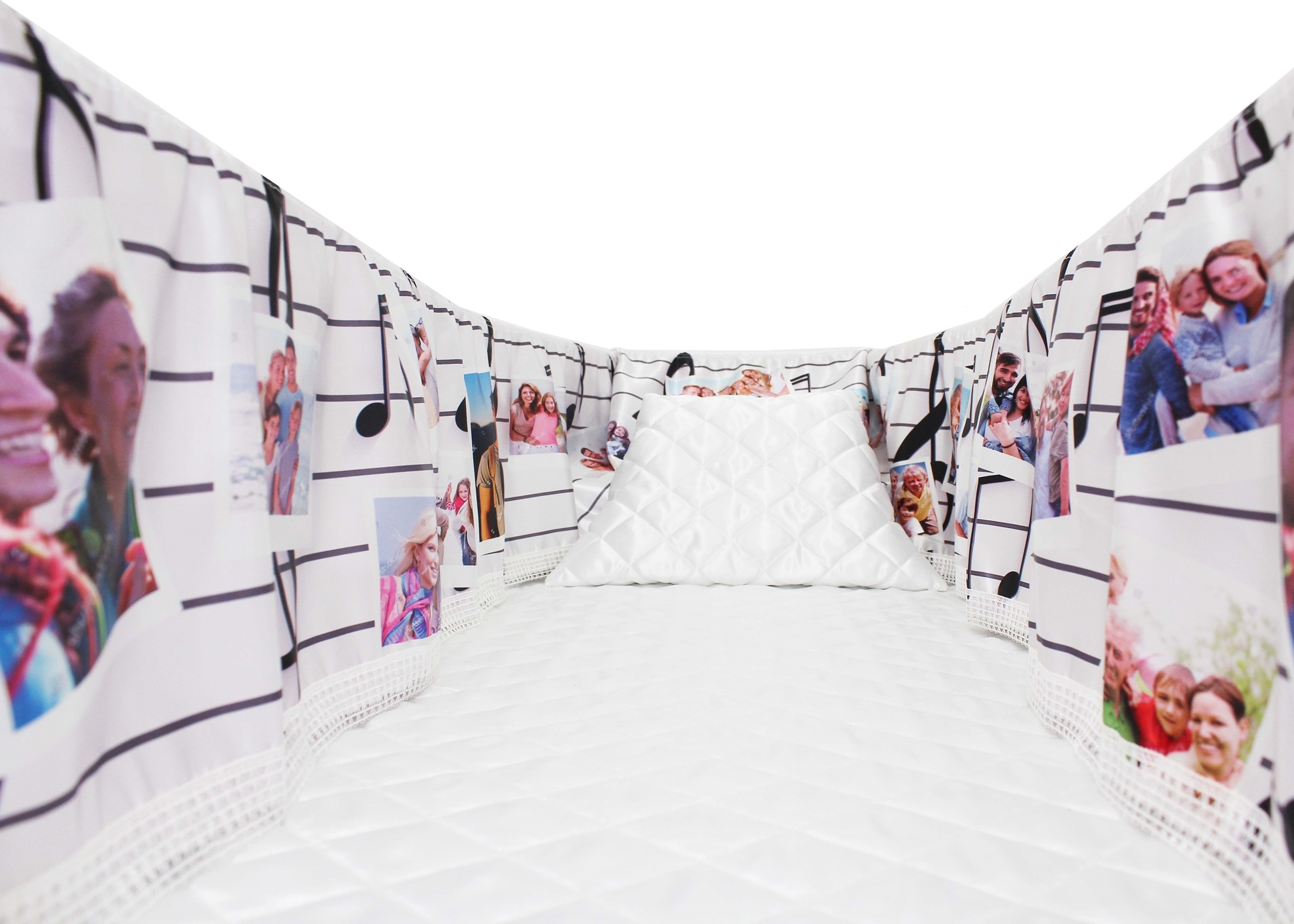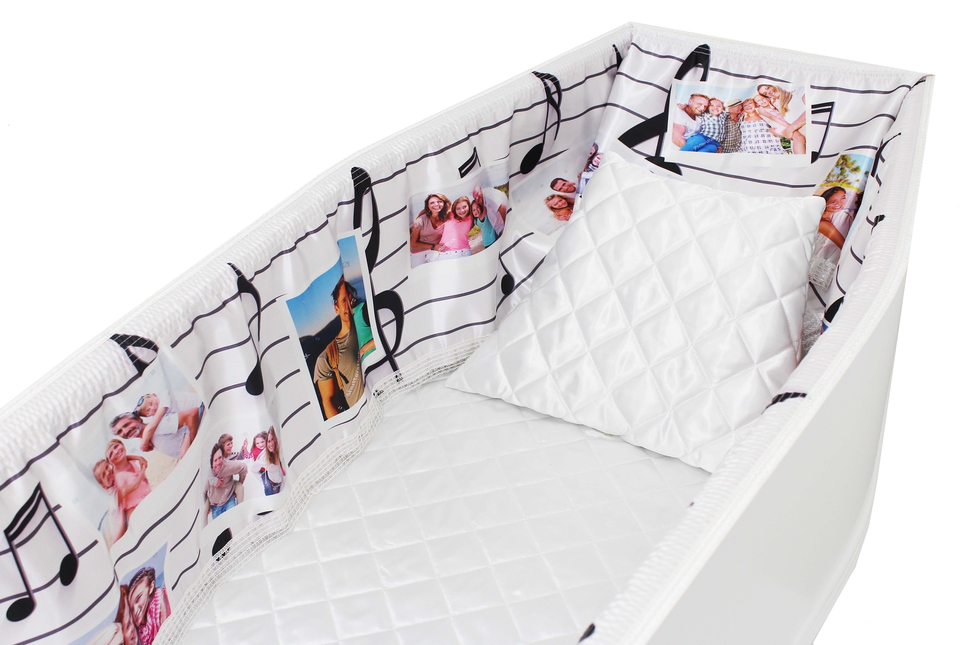 Luxury satin interior printed using water-based ink. The printed interior set consists of a 18-inch 2 Way printed satin frill, printed satin facecloth, quilted satin pillow and a quilted satin mattress.The chosen design will be printed on the interior. Image is to illustrate style of Interior Only.
