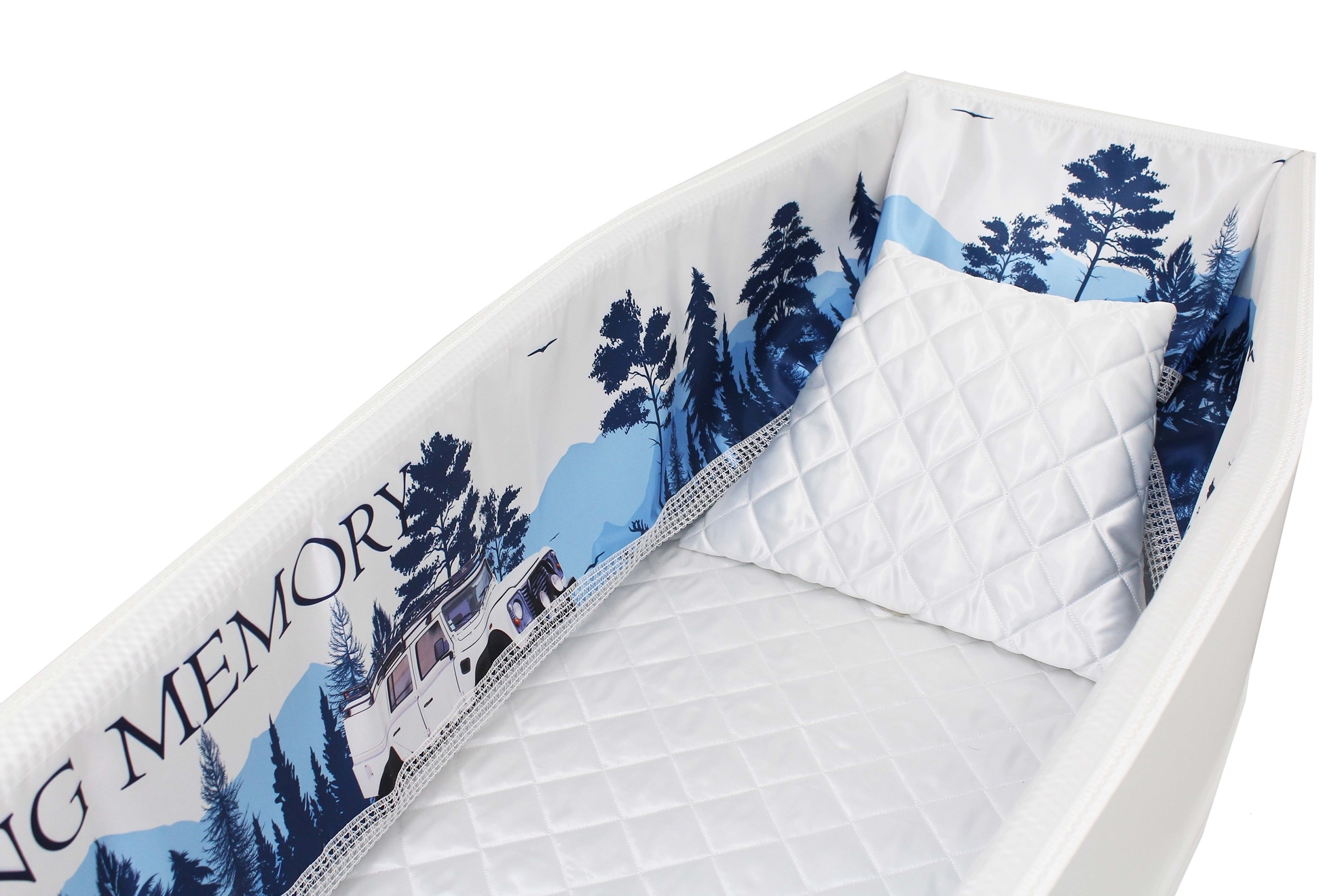 Luxury satin interior printed using water-based ink. The printed interior set consists of a 12-inch printed satin frill, printed satin facecloth, quilted satin pillow and a quilted satin mattress.