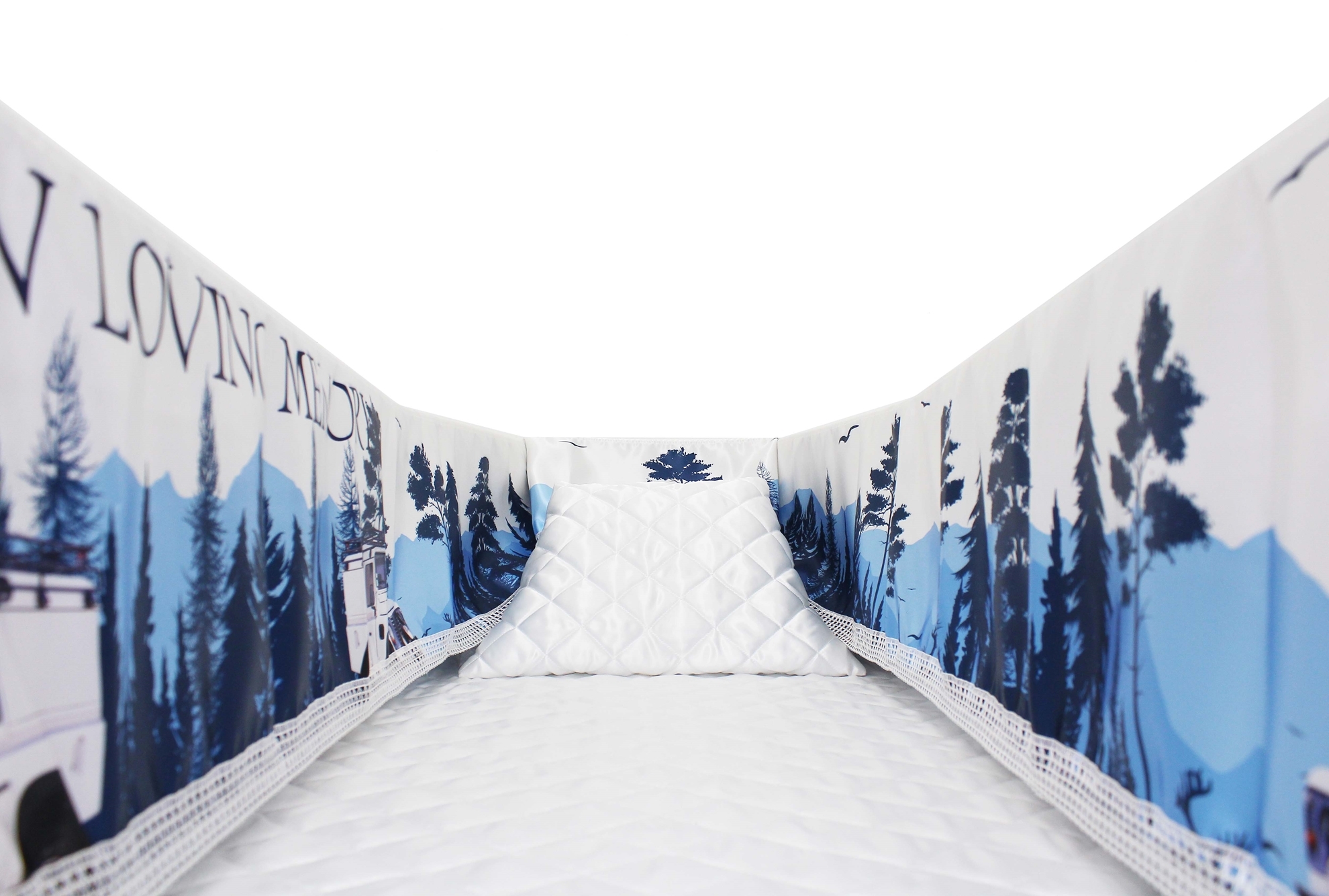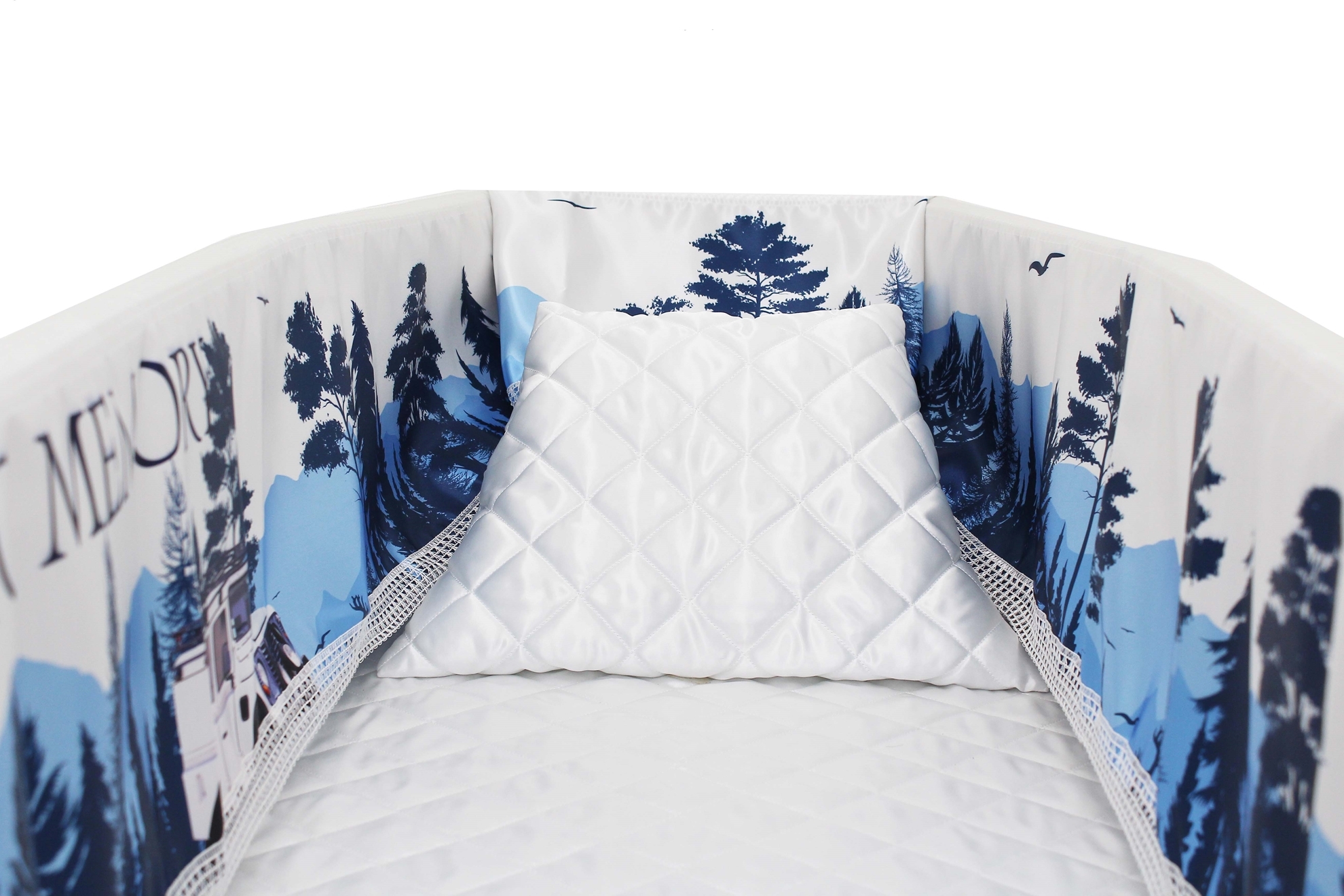 Luxury Satin 18-inch 2-way frill consisting of a 12-inch internal frill with an additional 6-inch exterior frill. The chosen design will be printed on the 18" 2-Way Frill. Please note the image shows a mattress and a pillow which are NOT included. Image is to illustrate style of Interior Only.