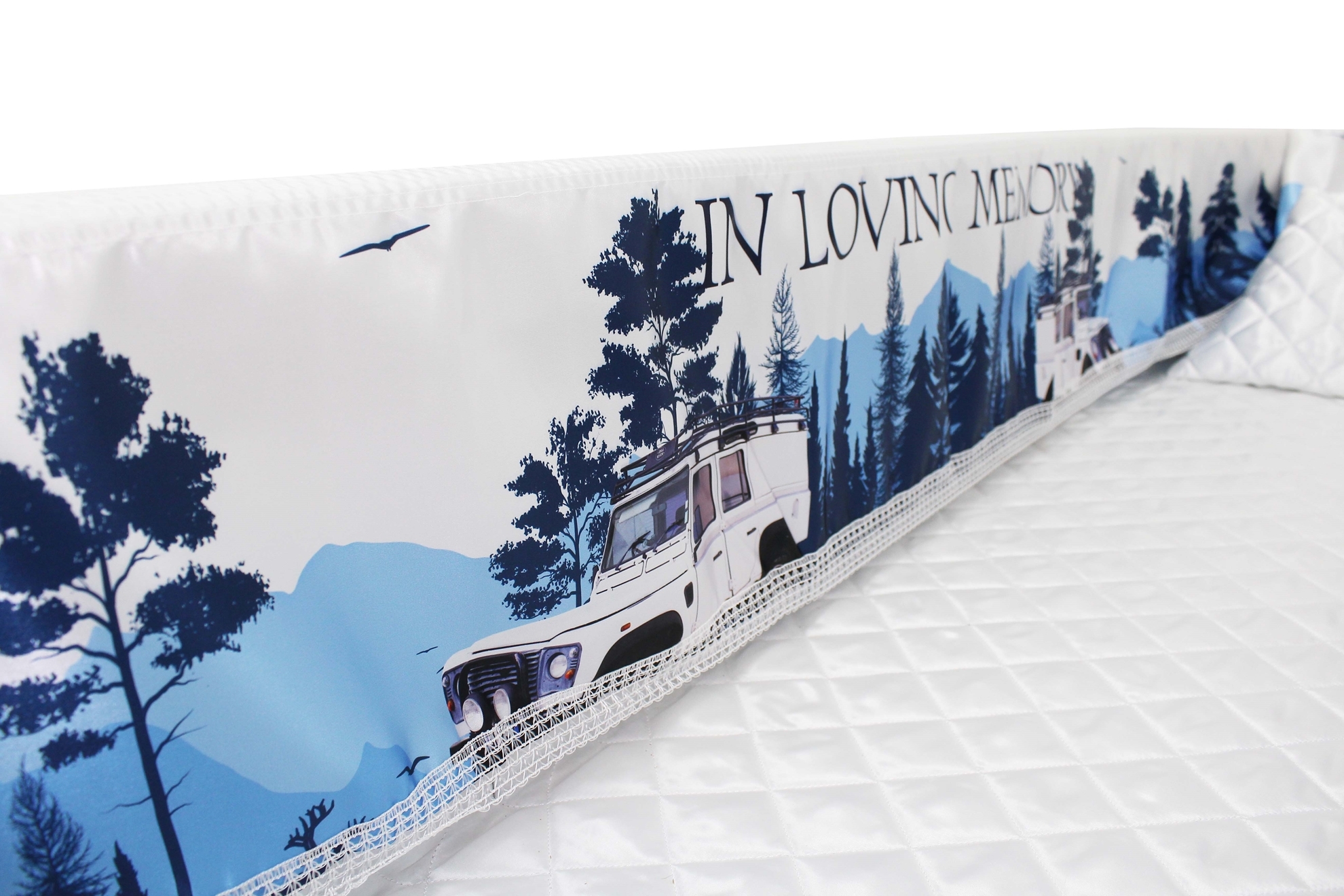 12-inch Printed Satin frill to be attached to the lip of the coffin/casket. Please note the image shows a mattress and pillow which are NOT included.