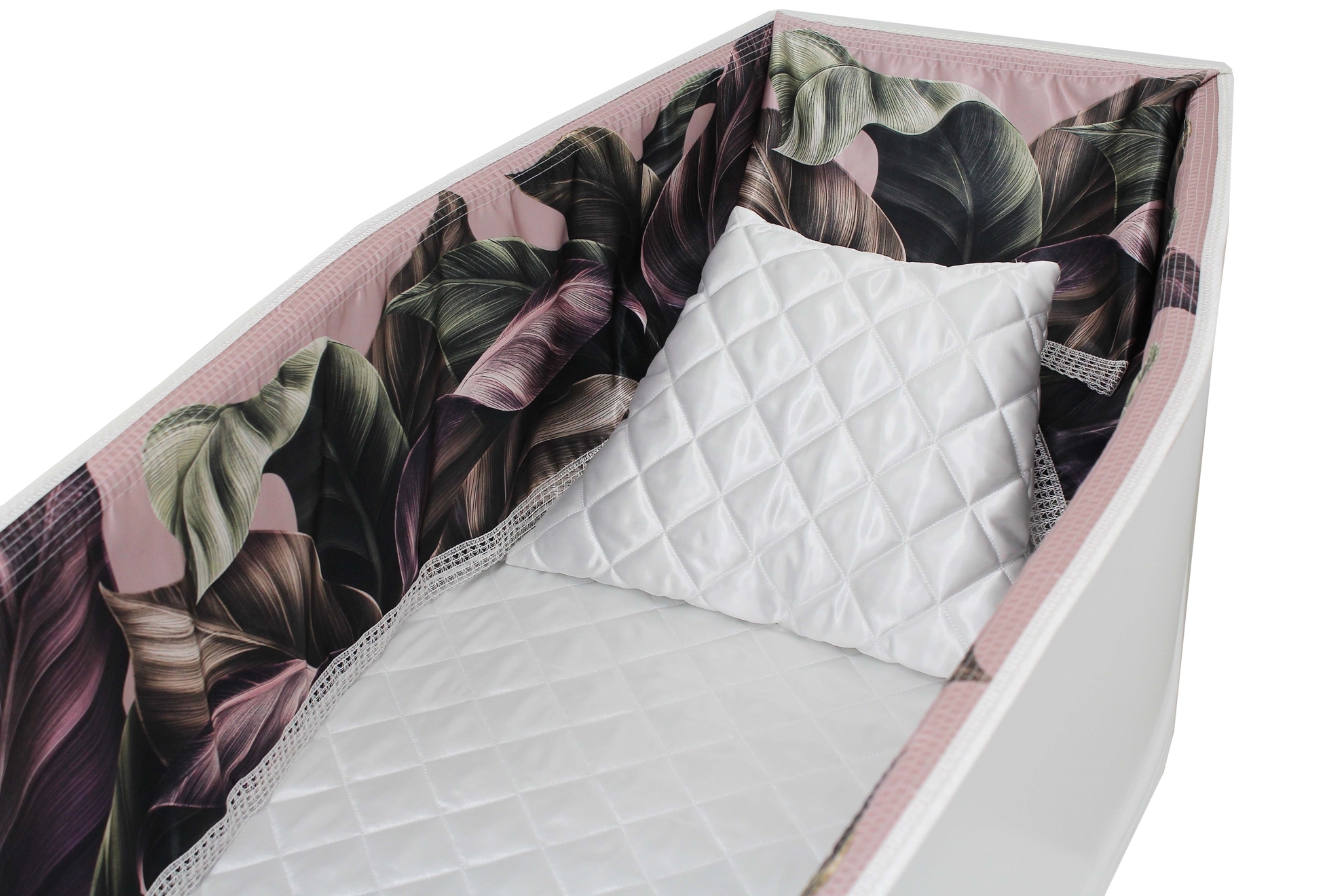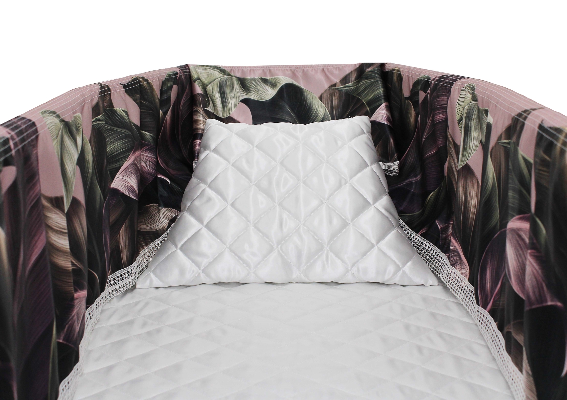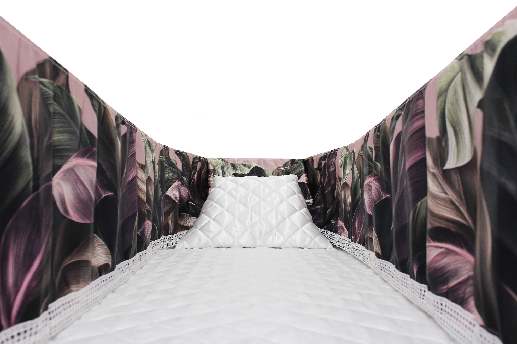 Luxury satin interior printed using water-based ink. The printed interior set consists of a 12-inch printed satin frill, printed satin facecloth, quilted satin pillow and a quilted satin mattress.