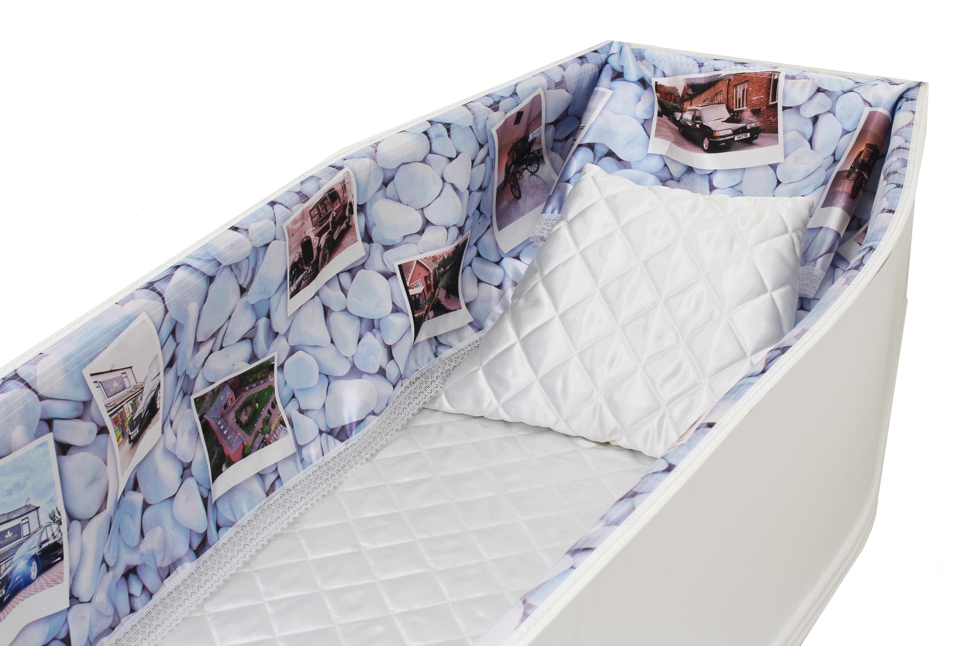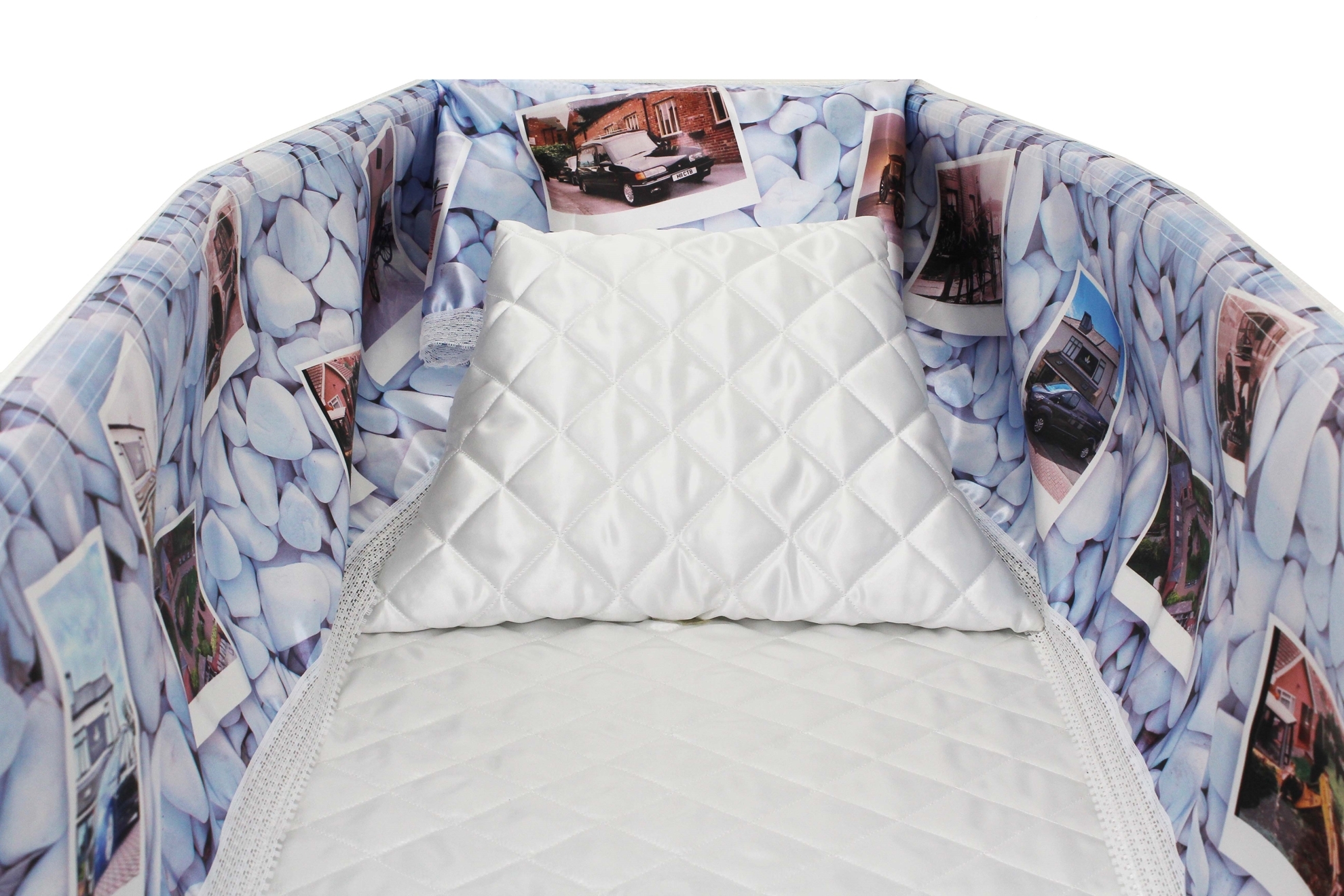 Luxury satin interior printed using water-based ink. The printed interior set consists of a 18-inch 2 Way printed satin frill, printed satin facecloth, quilted satin pillow and a quilted satin mattress.The chosen design will be printed on the interior. Image is to illustrate style of Interior Only.
