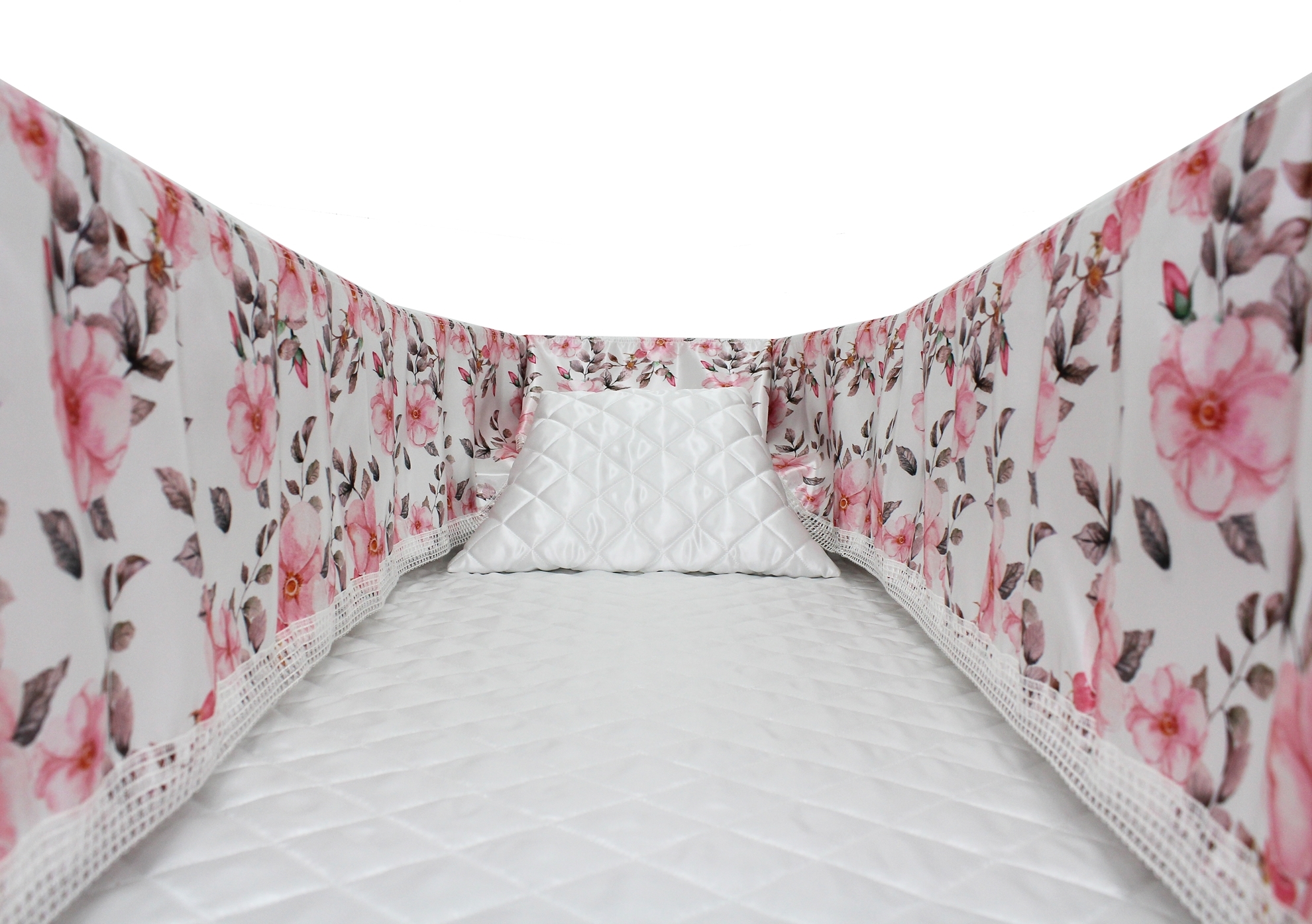 Luxury Satin 18-inch 2-way frill consisting of a 12-inch internal frill with an additional 6-inch exterior frill. The chosen design will be printed on the 18" 2-Way Frill. Please note the image shows a mattress and a pillow which are NOT included. Image is to illustrate style of Interior Only.
