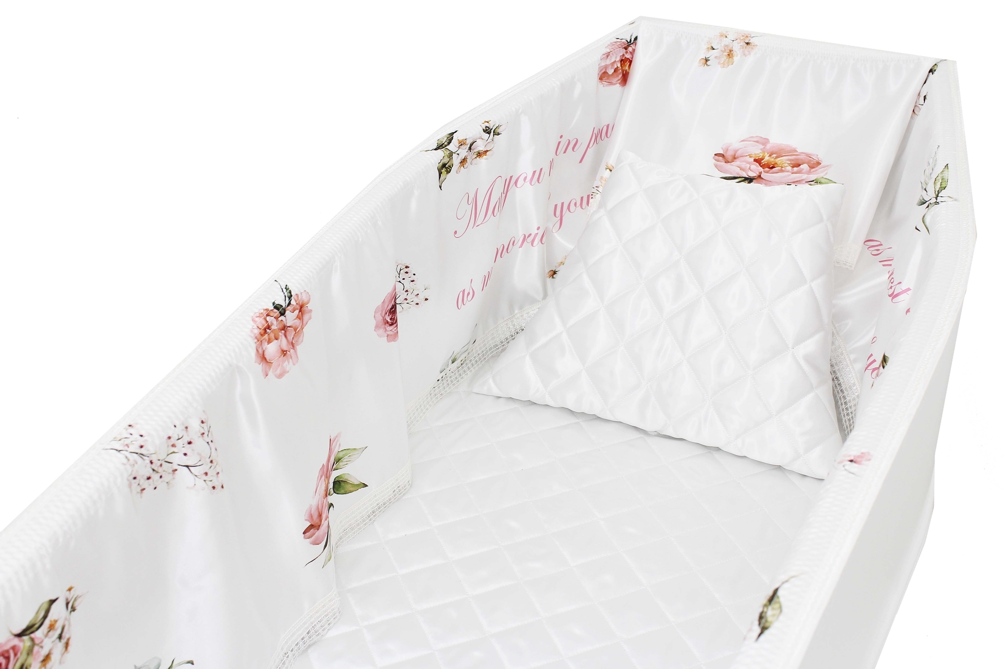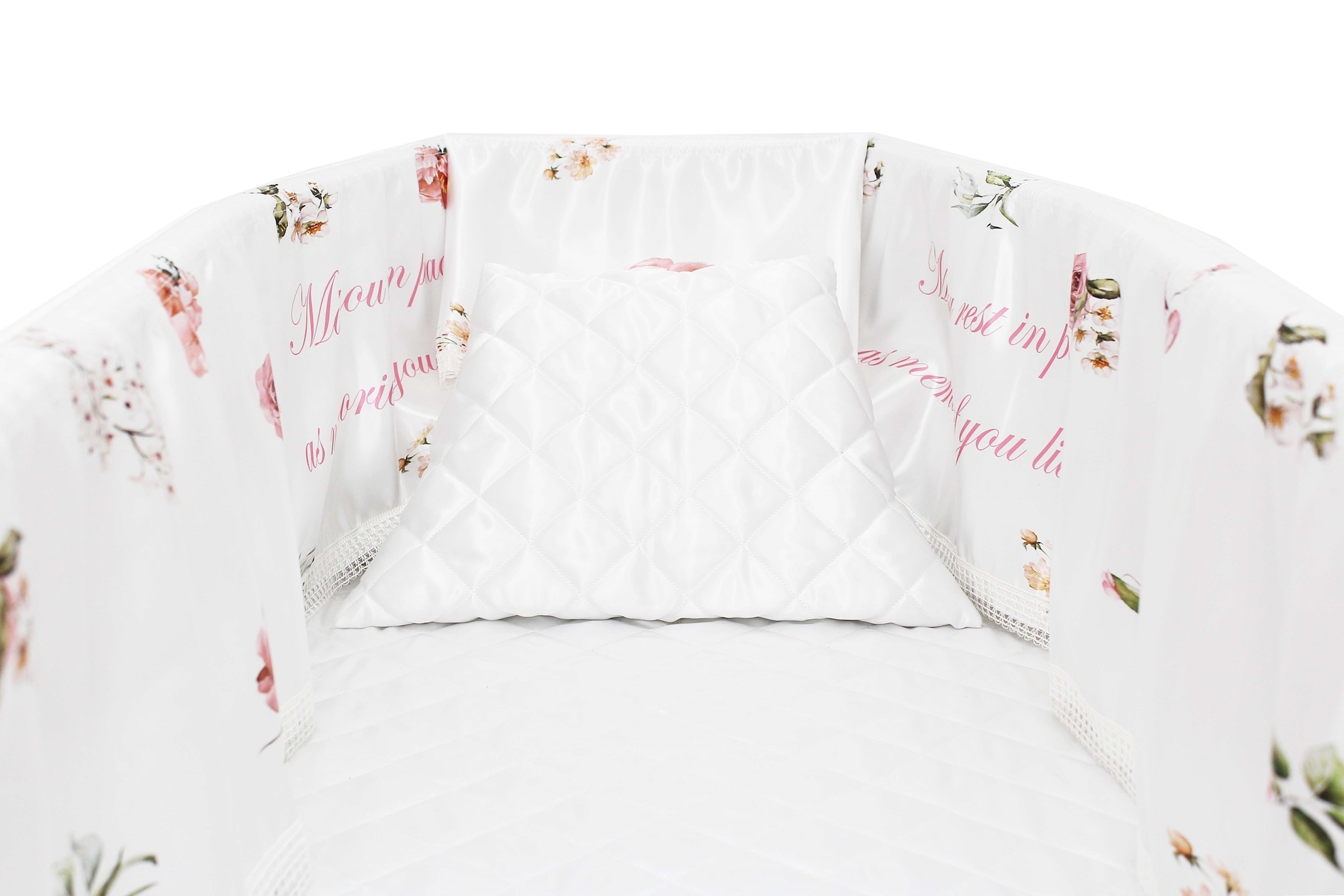 Luxury satin interior printed using water-based ink. The printed interior set consists of a 12-inch printed satin frill, printed satin facecloth, quilted satin pillow and a quilted satin mattress.