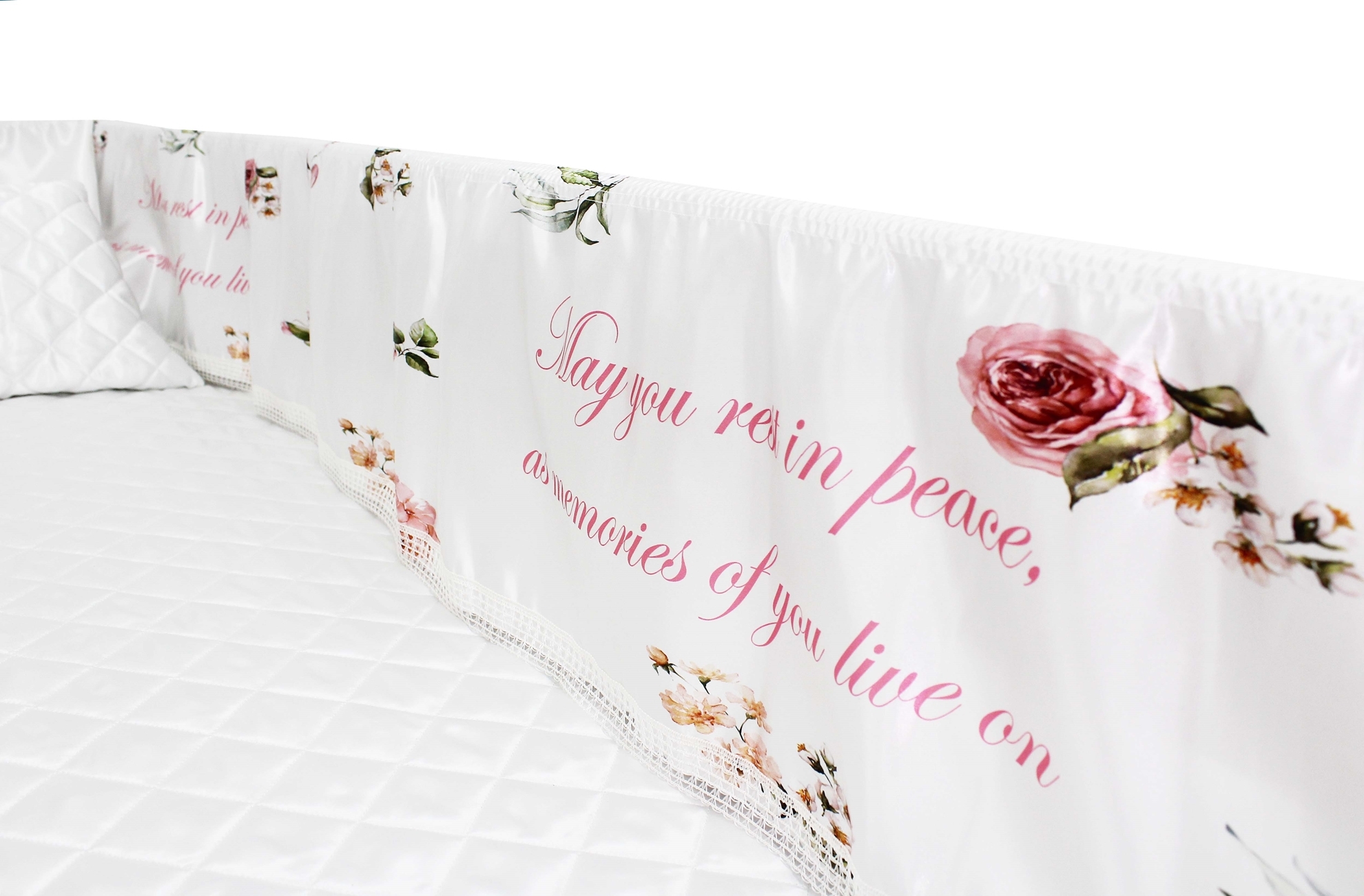 12-inch Printed Satin frill to be attached to the lip of the coffin/casket. Please note the image shows a mattress and pillow which are NOT included.