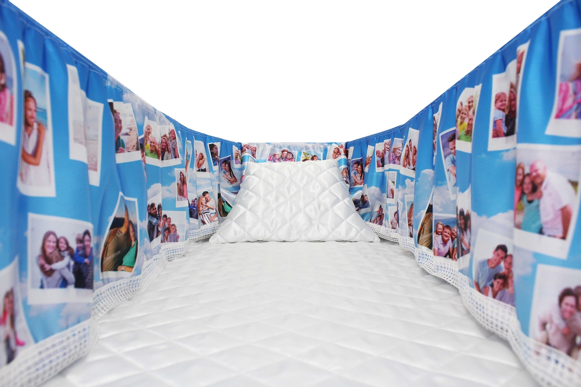 Luxury Satin 18-inch 2-way frill consisting of a 12-inch internal frill with an additional 6-inch exterior frill. The chosen design will be printed on the 18" 2-Way Frill. Please note the image shows a mattress and a pillow which are NOT included. Image is to illustrate style of Interior Only.