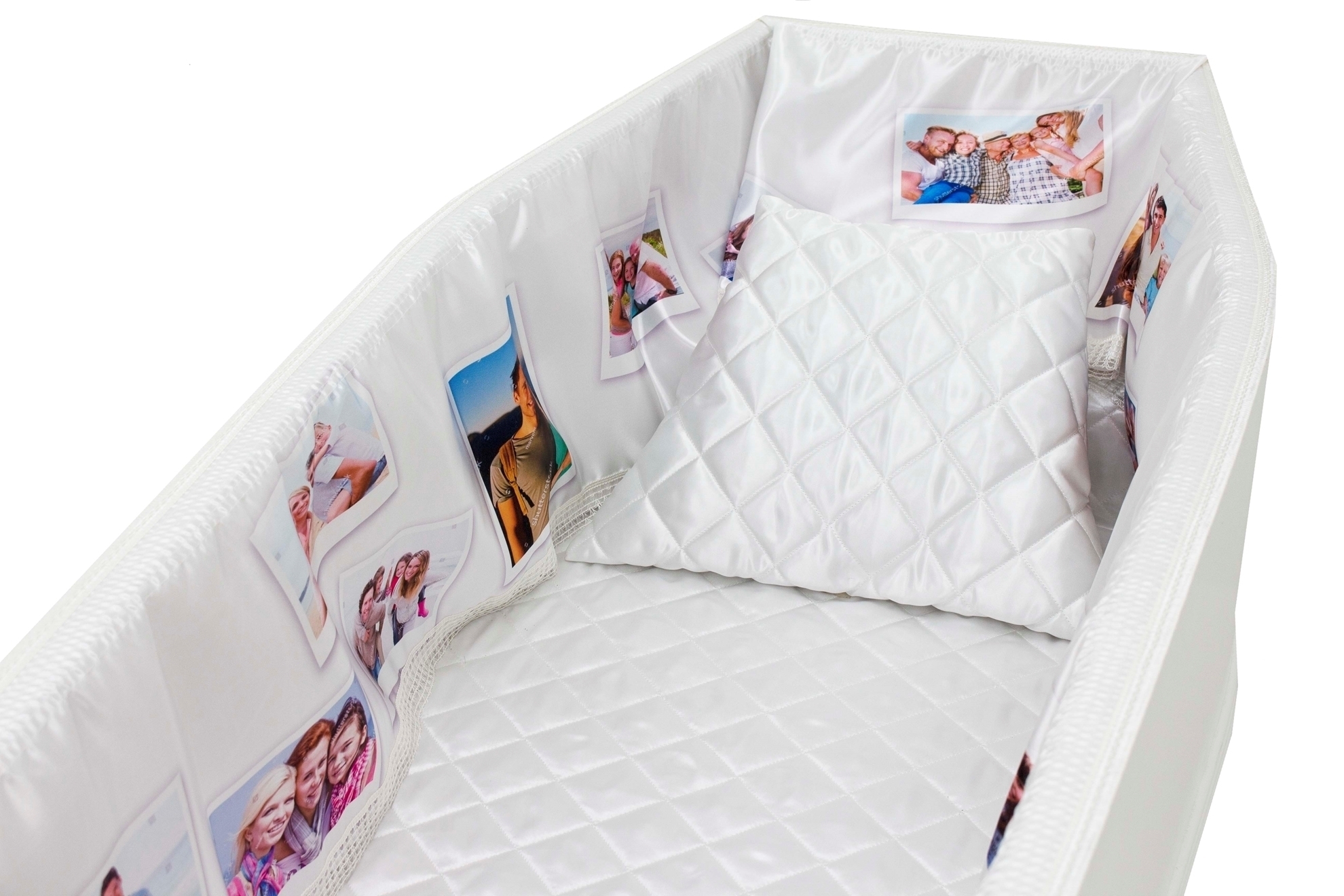 Luxury satin interior printed using water-based ink. The printed interior set consists of a 18-inch 2 Way printed satin frill, printed satin facecloth, quilted satin pillow and a quilted satin mattress.The chosen design will be printed on the interior. Image is to illustrate style of Interior Only.