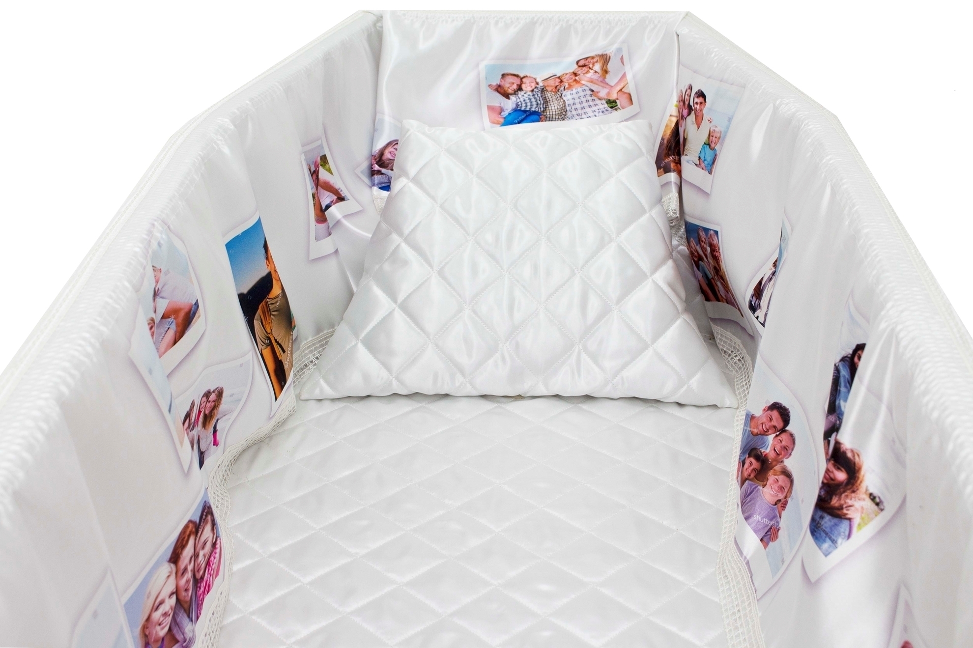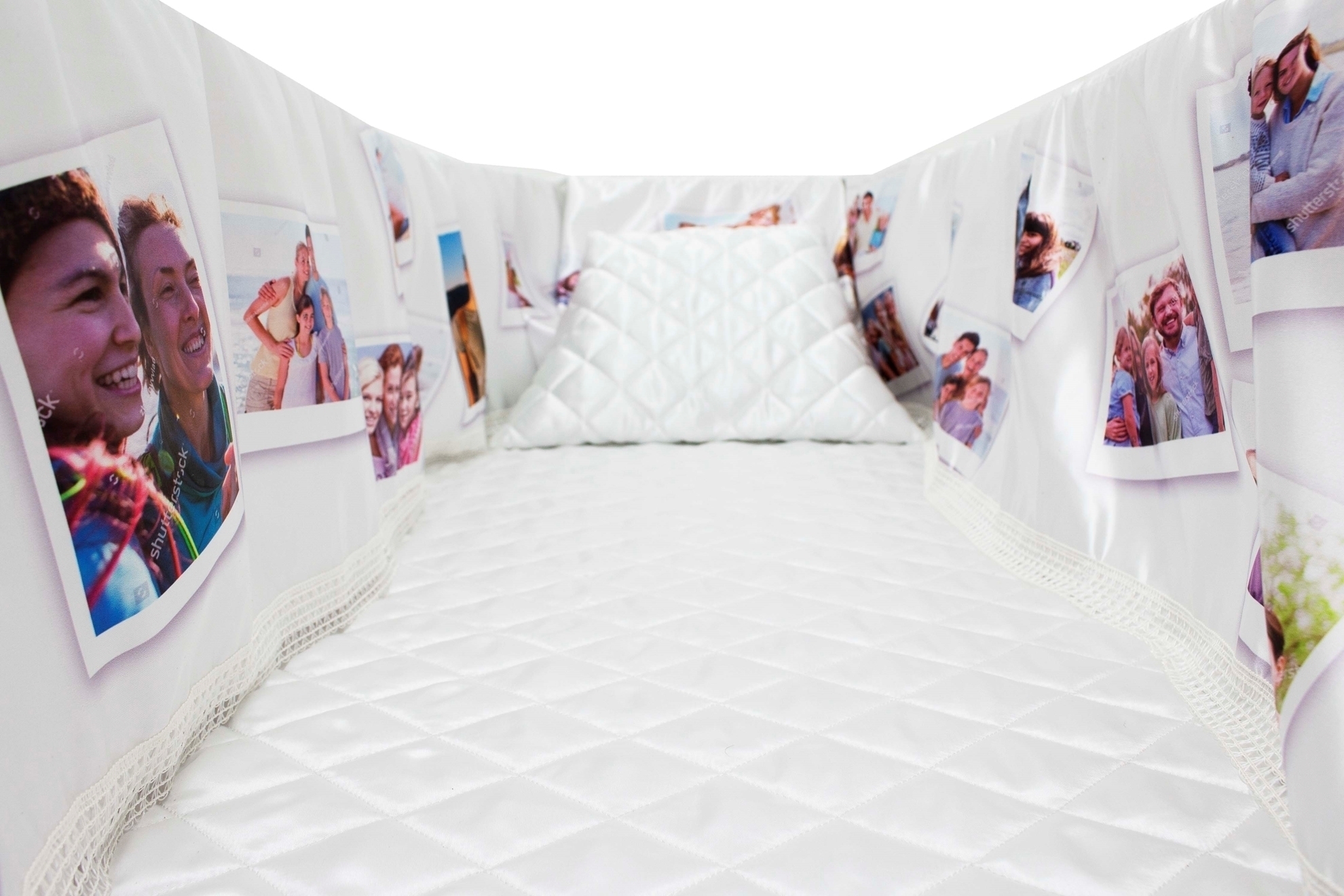 Luxury Satin 18-inch 2-way frill consisting of a 12-inch internal frill with an additional 6-inch exterior frill. The chosen design will be printed on the 18" 2-Way Frill. Please note the image shows a mattress and a pillow which are NOT included. Image is to illustrate style of Interior Only.