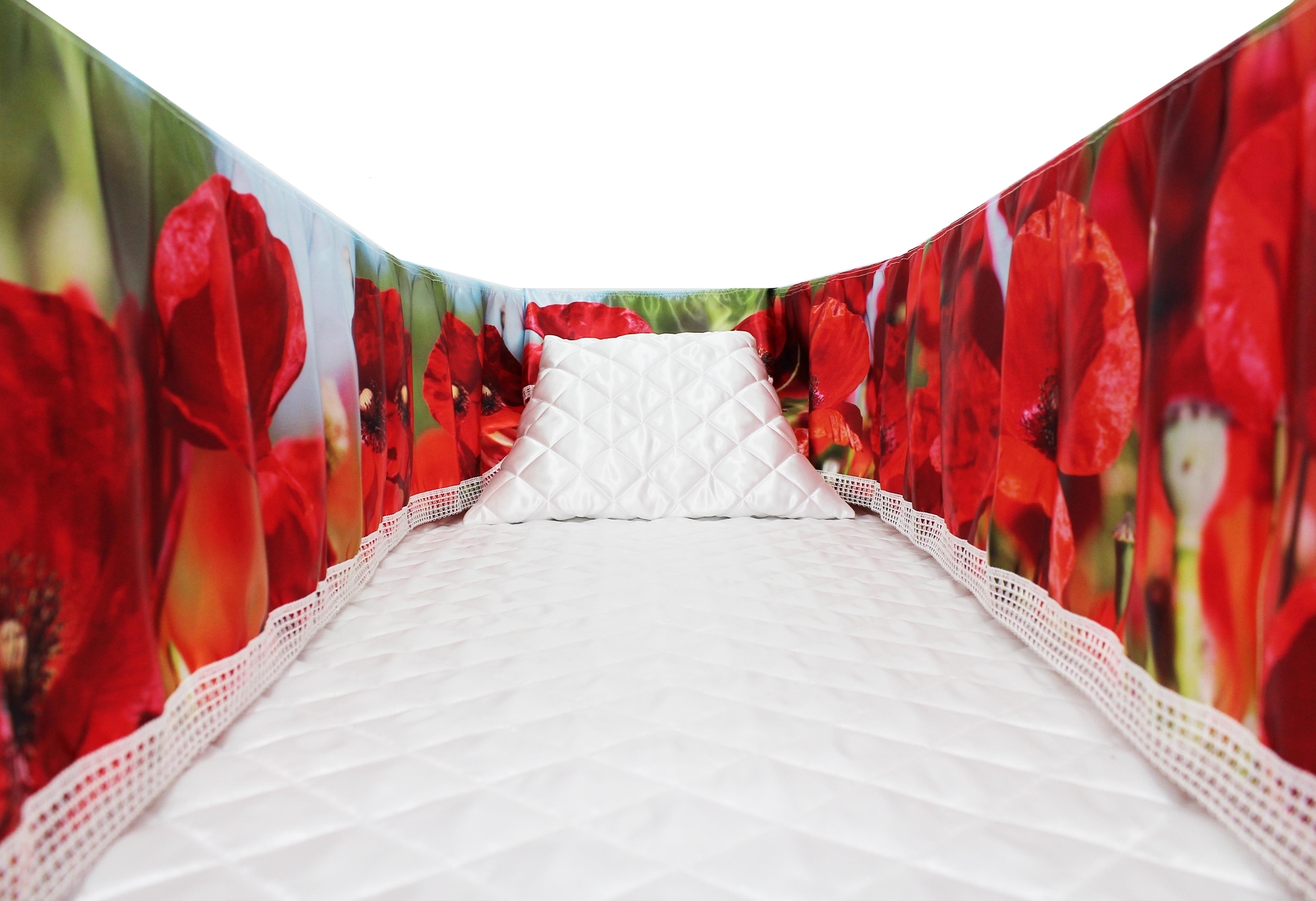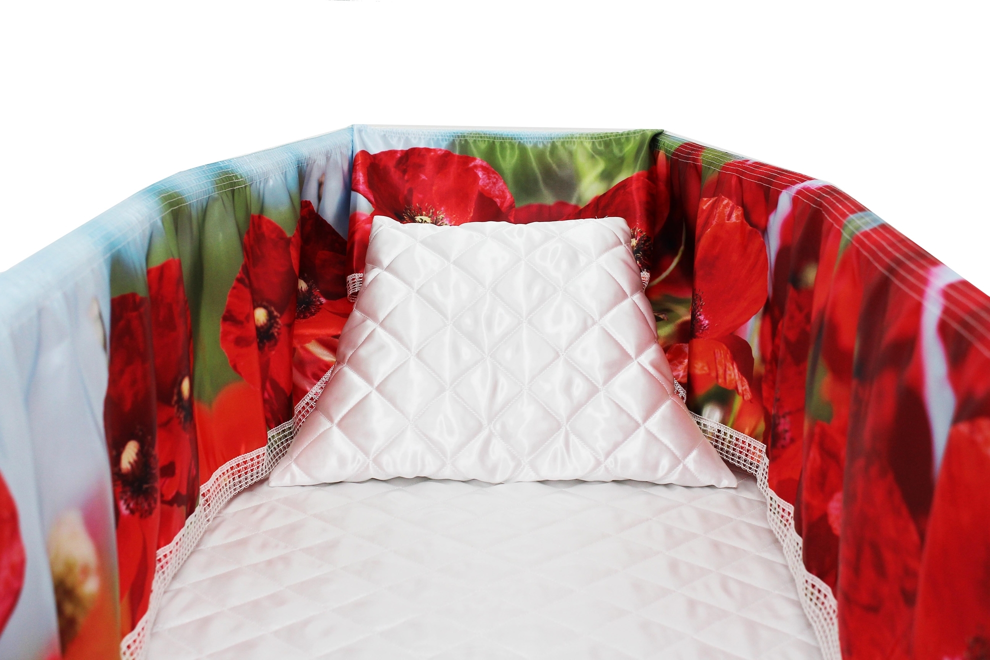 Luxury satin interior printed using water-based ink. The printed interior set consists of a 12-inch printed satin frill, printed satin facecloth, quilted satin pillow and a quilted satin mattress.