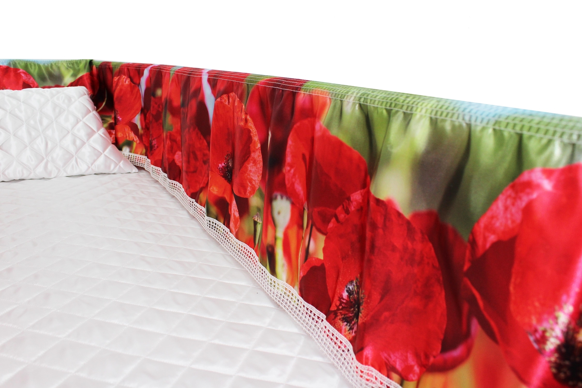 Luxury Satin 18-inch 2-way frill consisting of a 12-inch internal frill with an additional 6-inch exterior frill. The chosen design will be printed on the 18" 2-Way Frill. Please note the image shows a mattress and a pillow which are NOT included. Image is to illustrate style of Interior Only.
