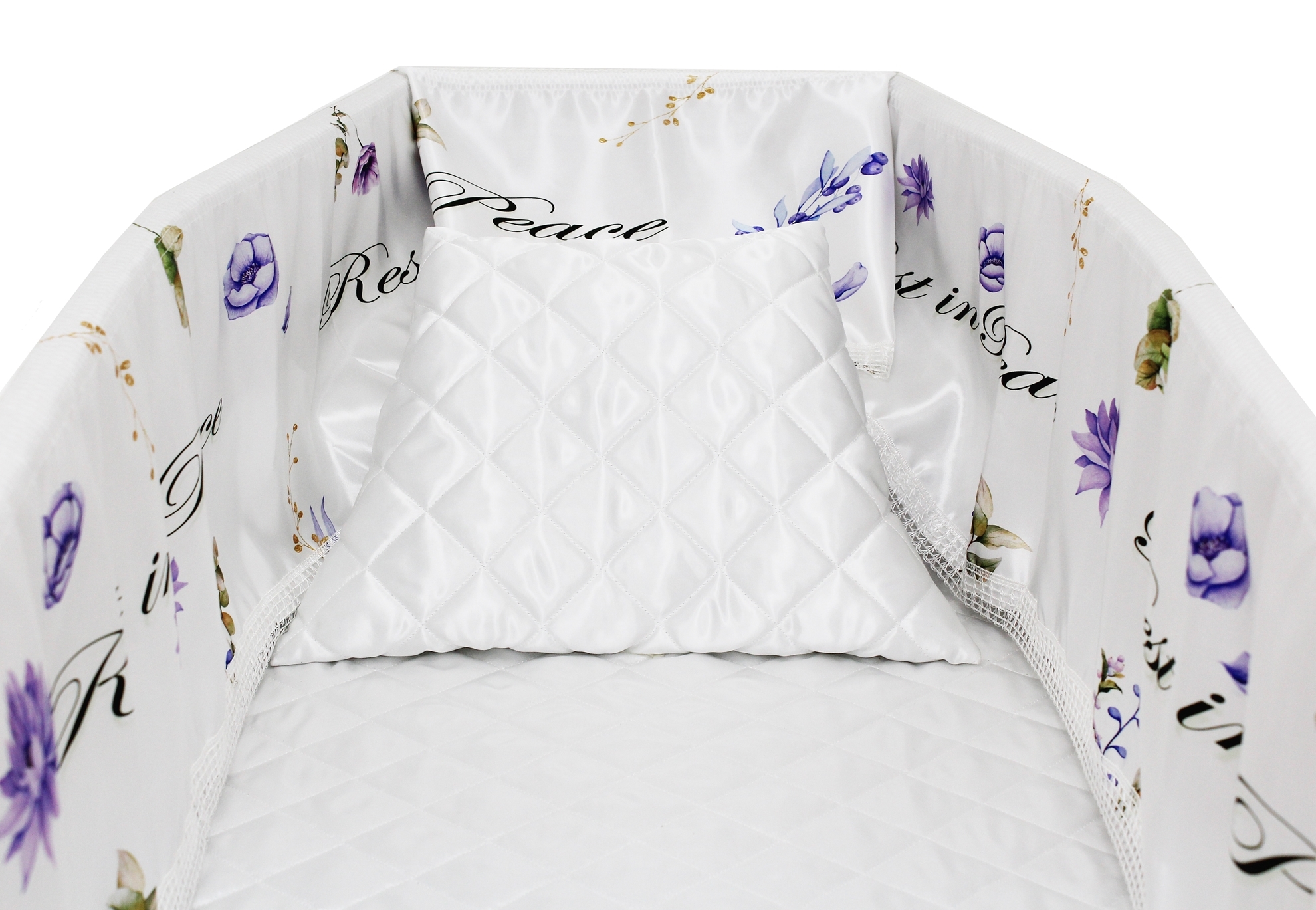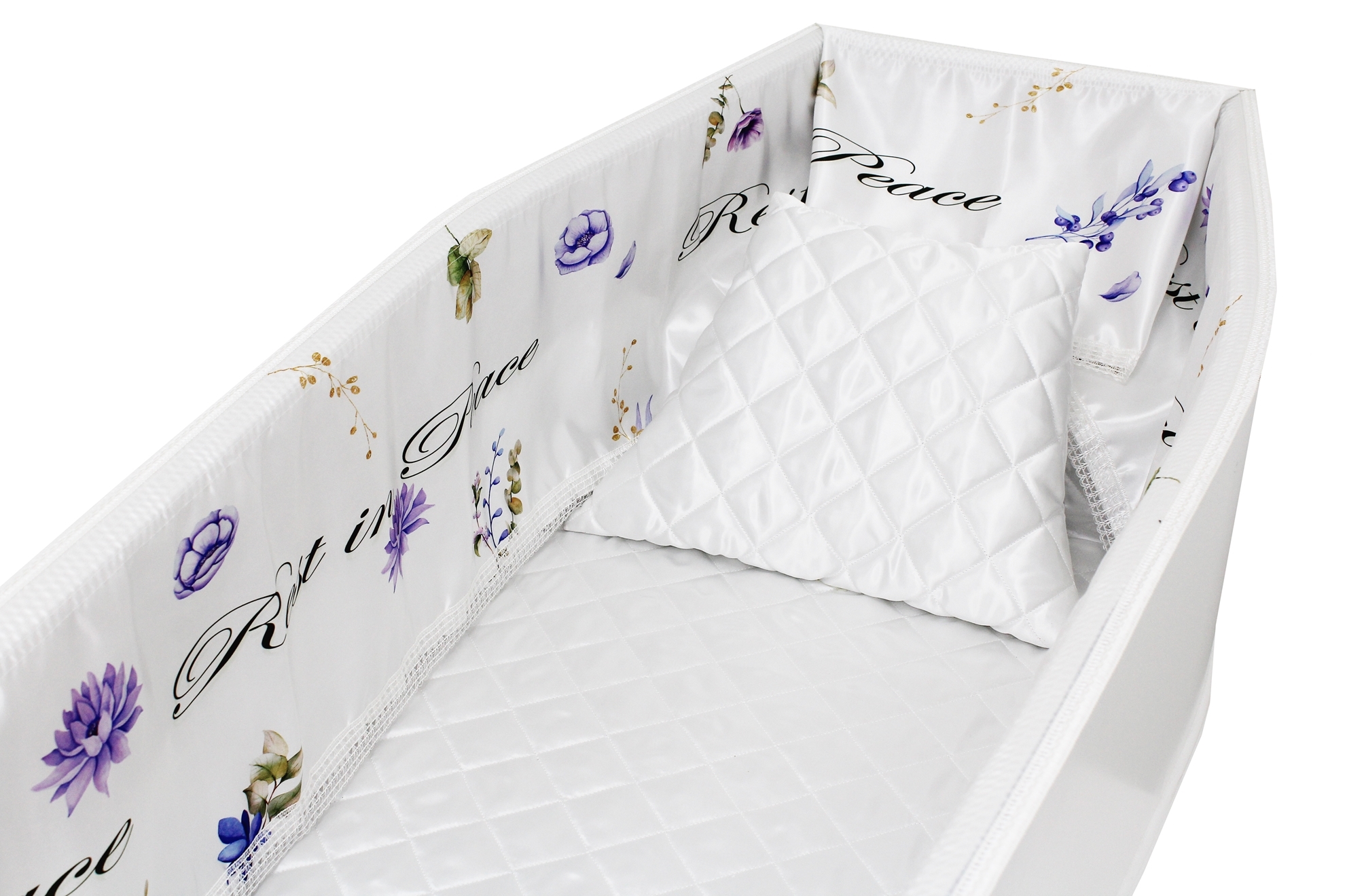 Luxury satin interior printed using water-based ink. The printed interior set consists of a 18-inch 2 Way printed satin frill, printed satin facecloth, quilted satin pillow and a quilted satin mattress.The chosen design will be printed on the interior. Image is to illustrate style of Interior Only.