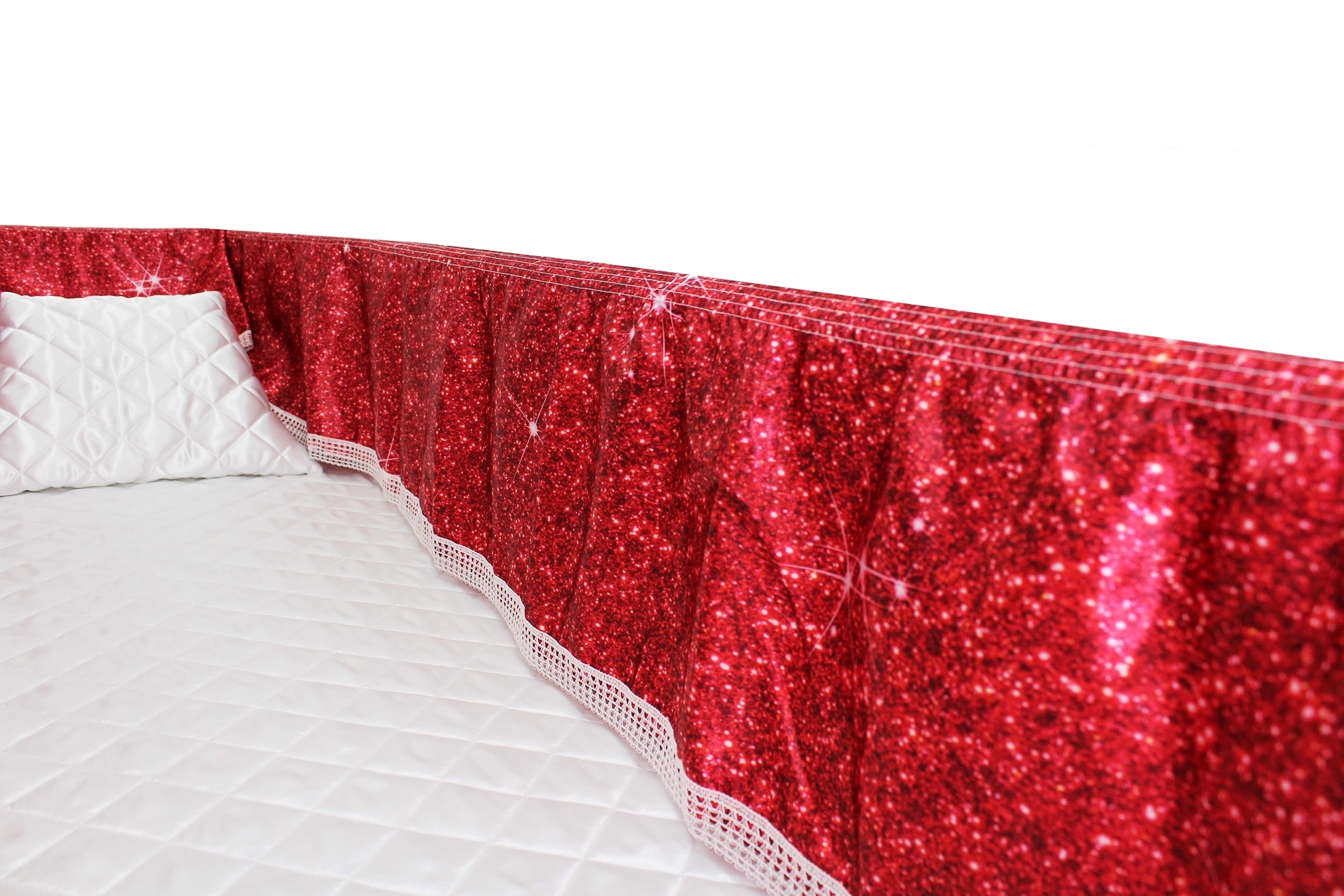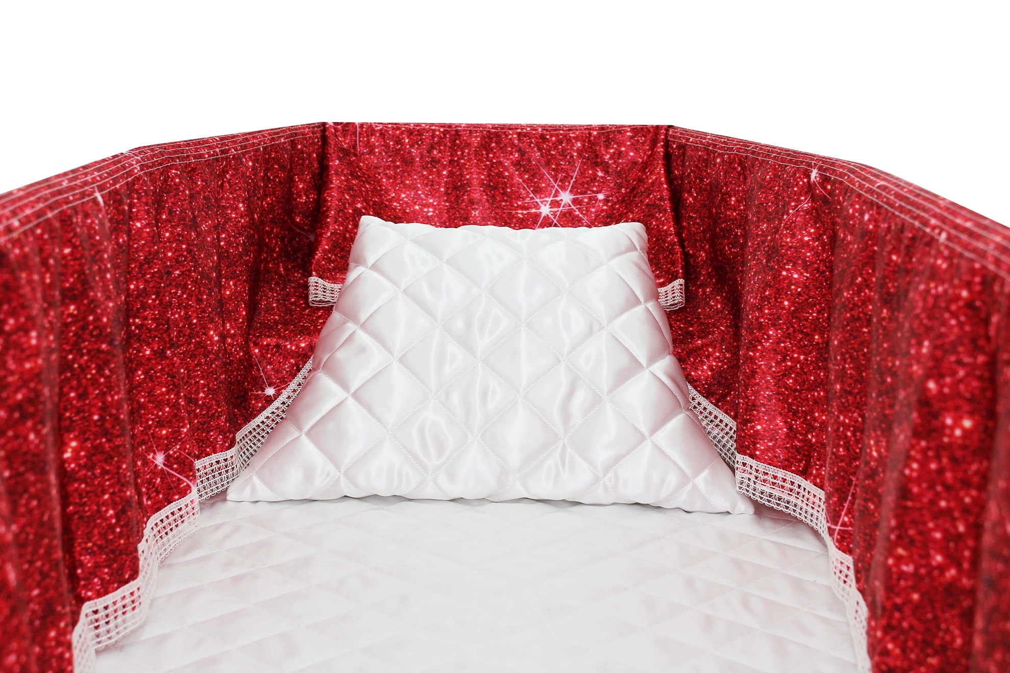 Luxury Satin 18-inch 2-way frill consisting of a 12-inch internal frill with an additional 6-inch exterior frill. The chosen design will be printed on the 18" 2-Way Frill. Please note the image shows a mattress and a pillow which are NOT included. Image is to illustrate style of Interior Only.