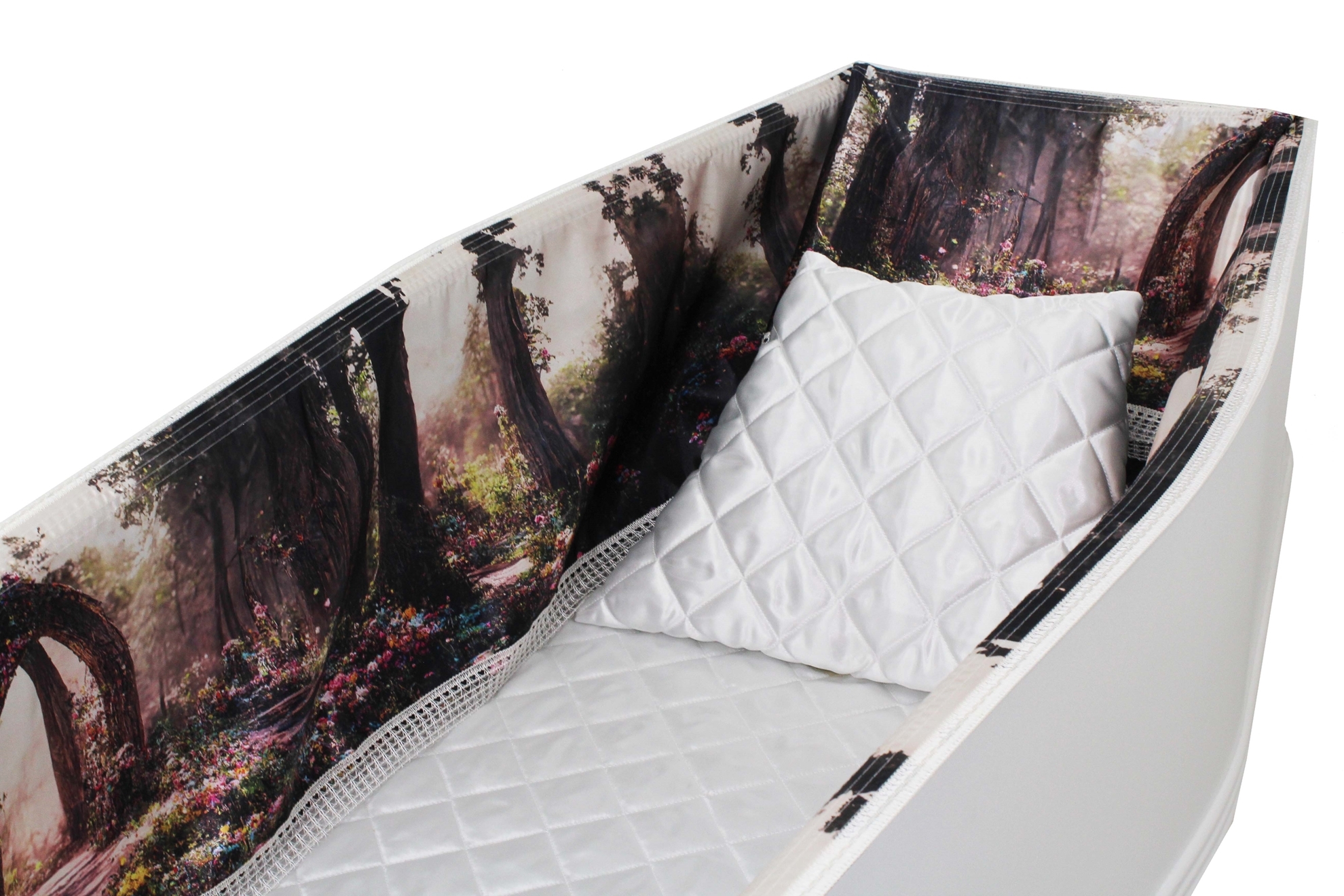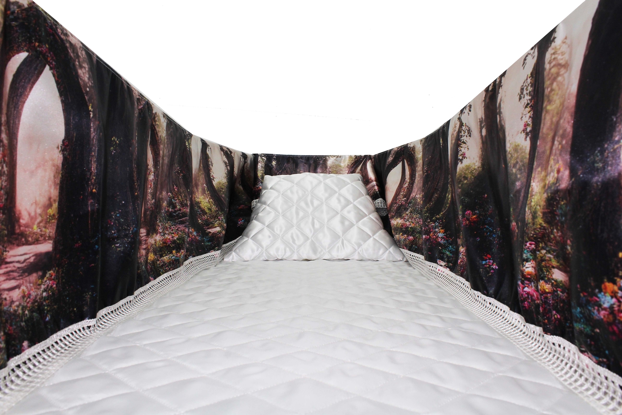 Luxury satin interior printed using water-based ink. The printed interior set consists of a 18-inch 2 Way printed satin frill, printed satin facecloth, quilted satin pillow and a quilted satin mattress.The chosen design will be printed on the interior. Image is to illustrate style of Interior Only.