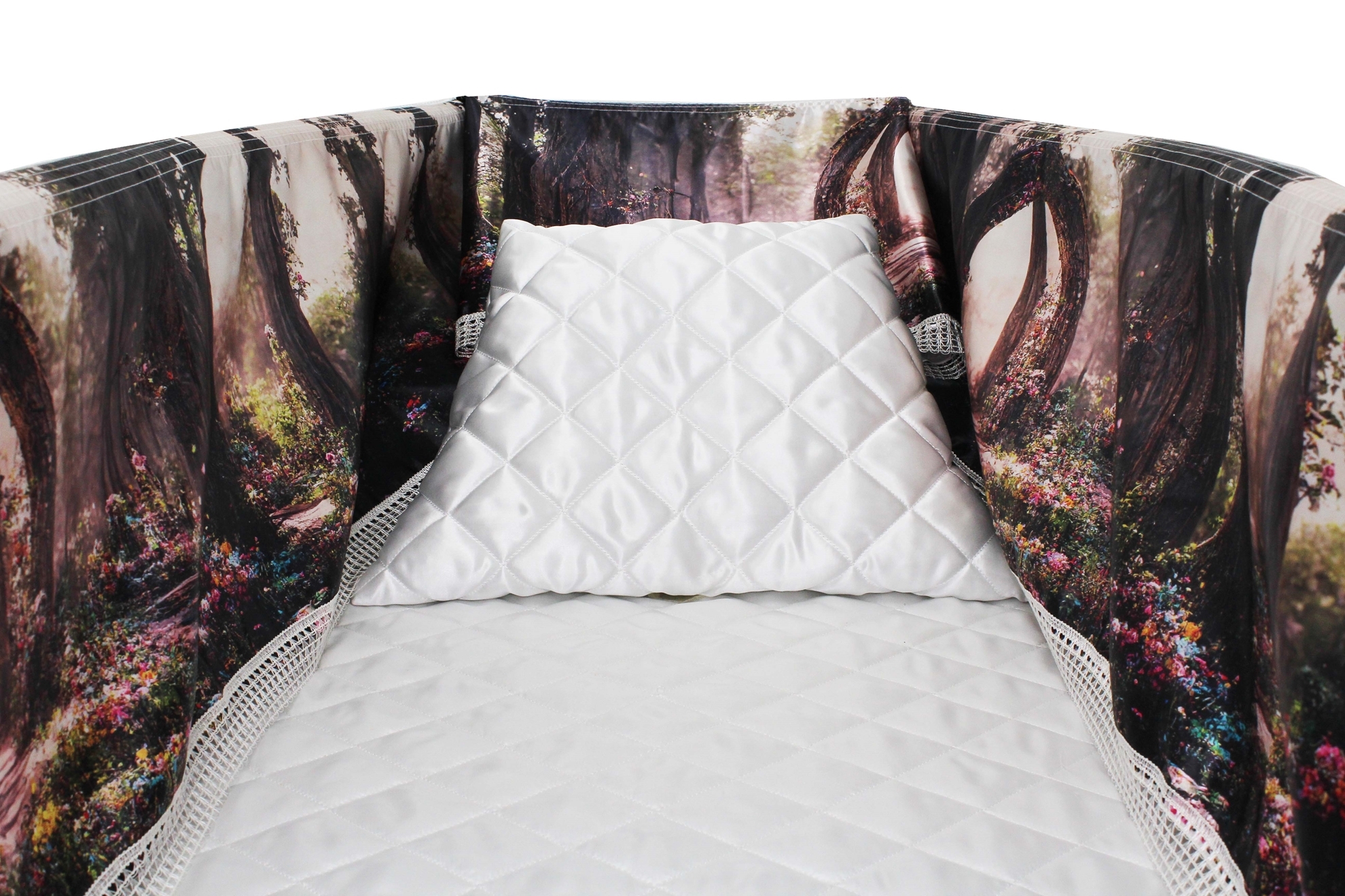 Luxury satin interior printed using water-based ink. The printed interior set consists of a 12-inch printed satin frill, printed satin facecloth, quilted satin pillow and a quilted satin mattress.