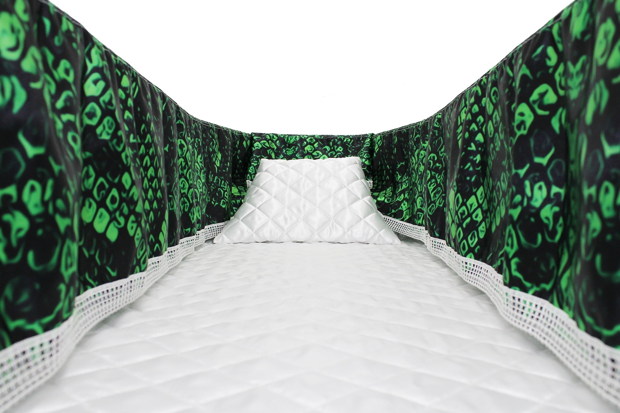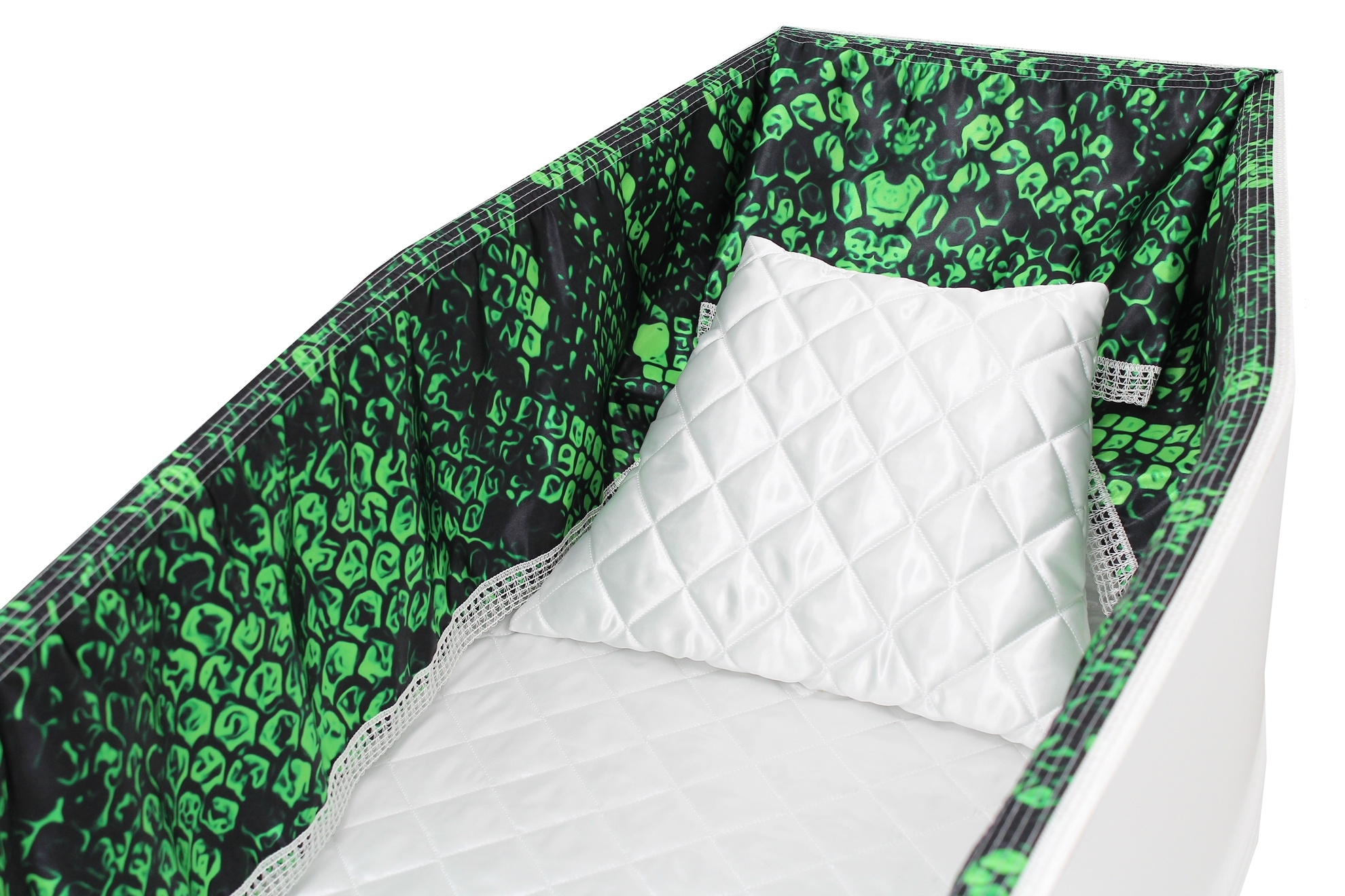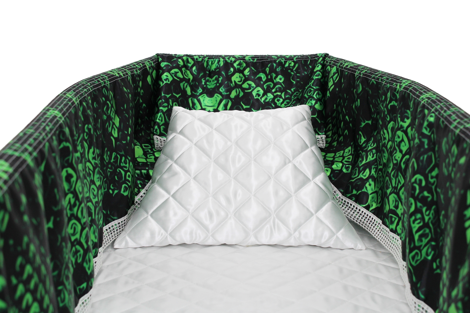 Luxury satin interior printed using water-based ink. The printed interior set consists of a 18-inch 2 Way printed satin frill, printed satin facecloth, quilted satin pillow and a quilted satin mattress.The chosen design will be printed on the interior. Image is to illustrate style of Interior Only.